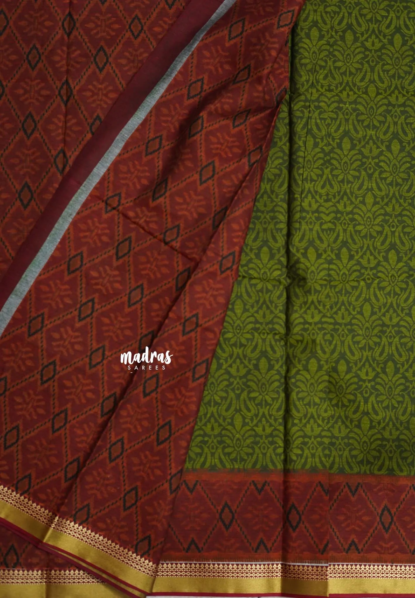 Olive Green - Kalanjali Soft chanderi silk with Bagru Floral Prints - Best for Office Wear