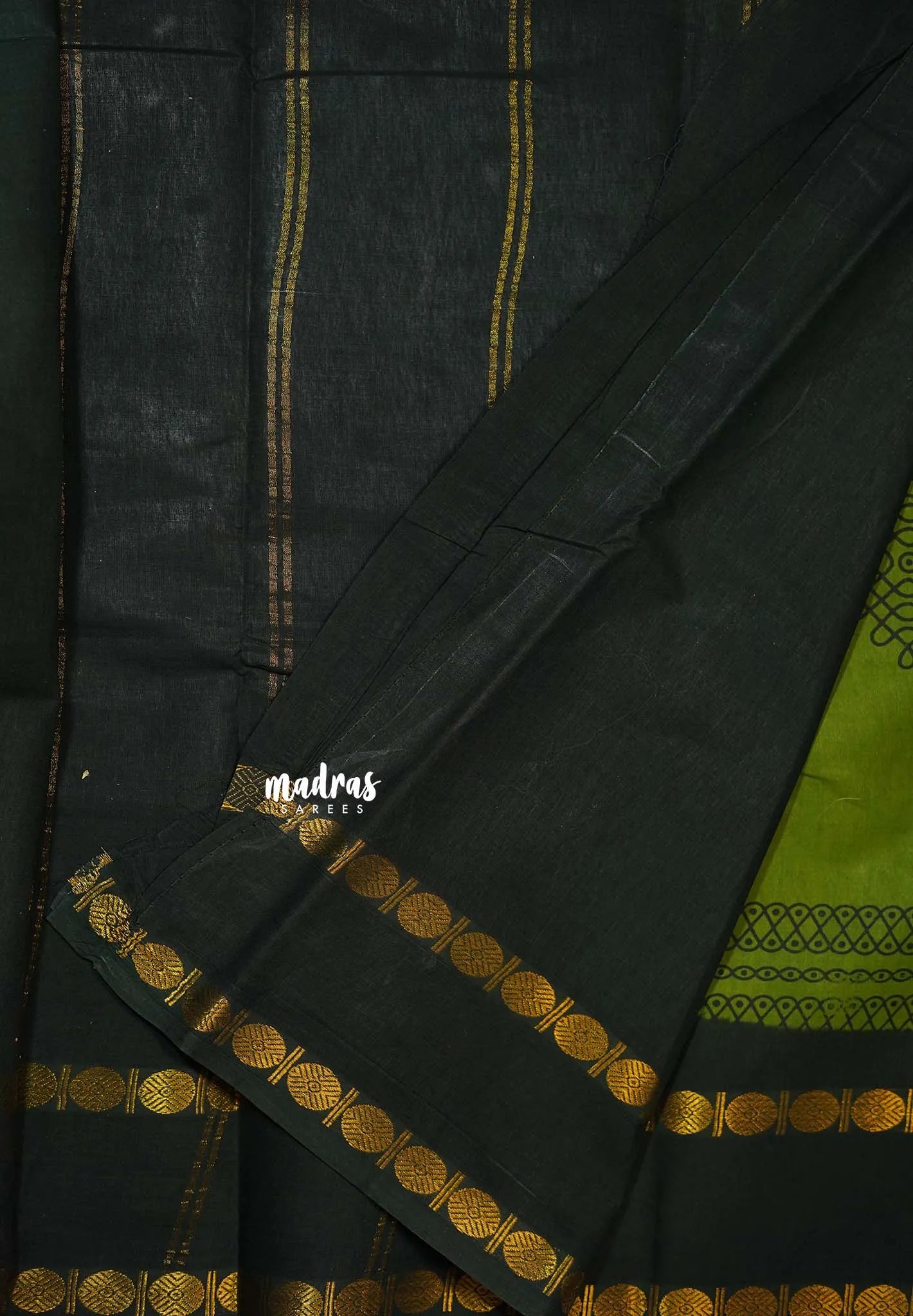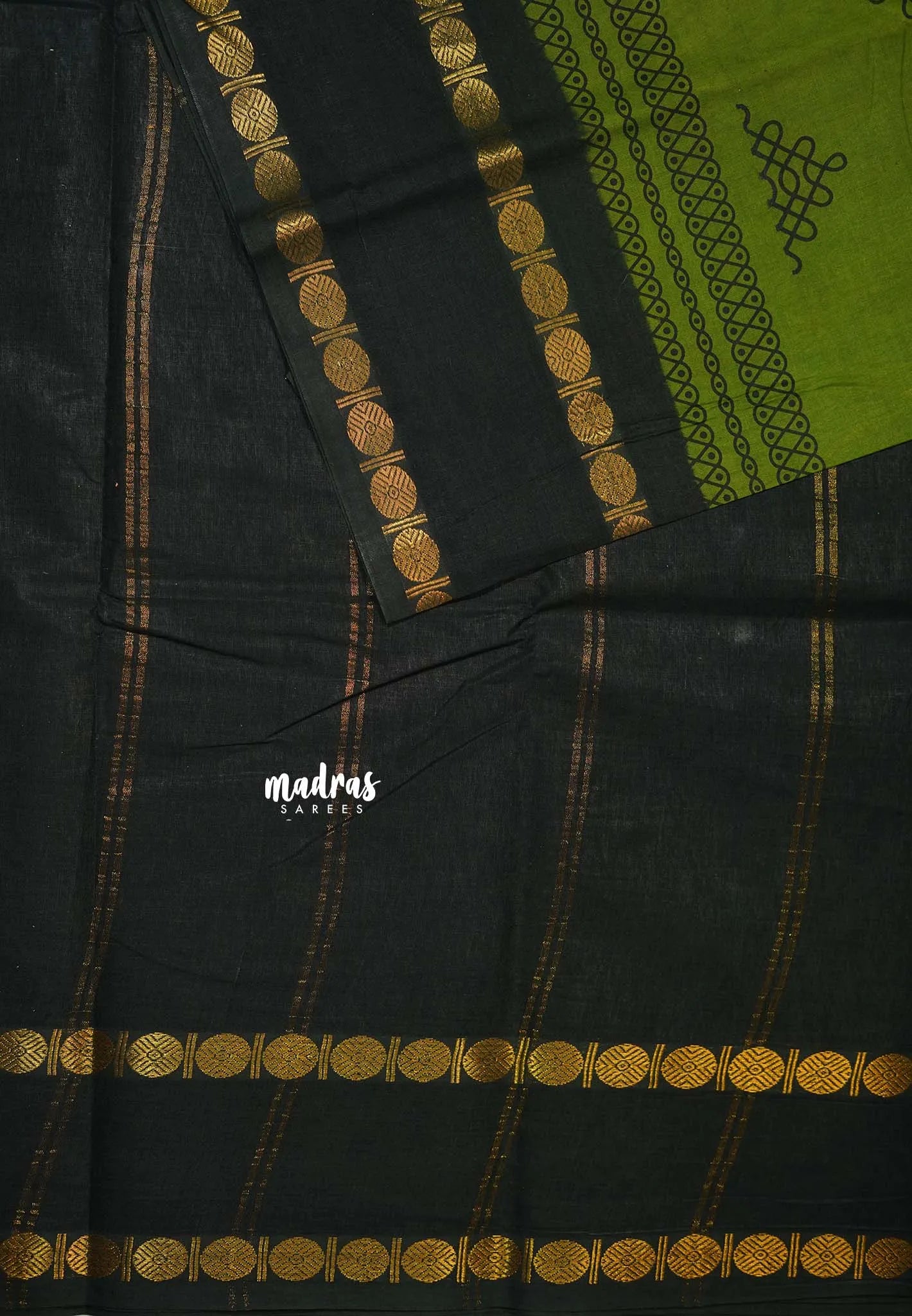 Named after M.S. Subbulakshmi, the voice that defined devotion and Margazhi mornings, this Sungudi cotton saree is a tribute to tradition, rhythm, and spiritual elegance. Crafted in authentic Sungudi cotton, the saree features kolam-inspired motifs across the body, symbolising auspicious beginnings, paired with a Rudraksham-inspired border that reflects sacred geometry and timeless South Indian design.