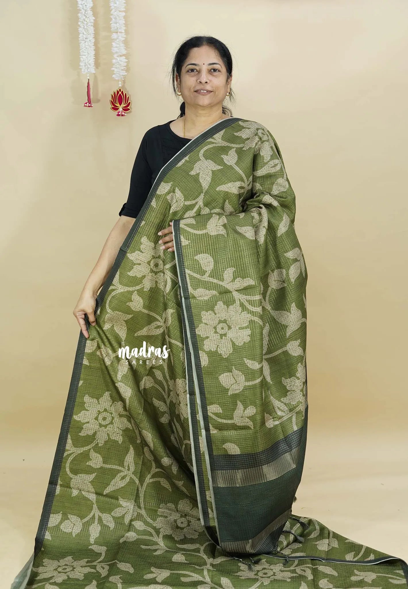 Olive Green - Sundari – Premium Kota Tussar Silk Saree with floral prints body