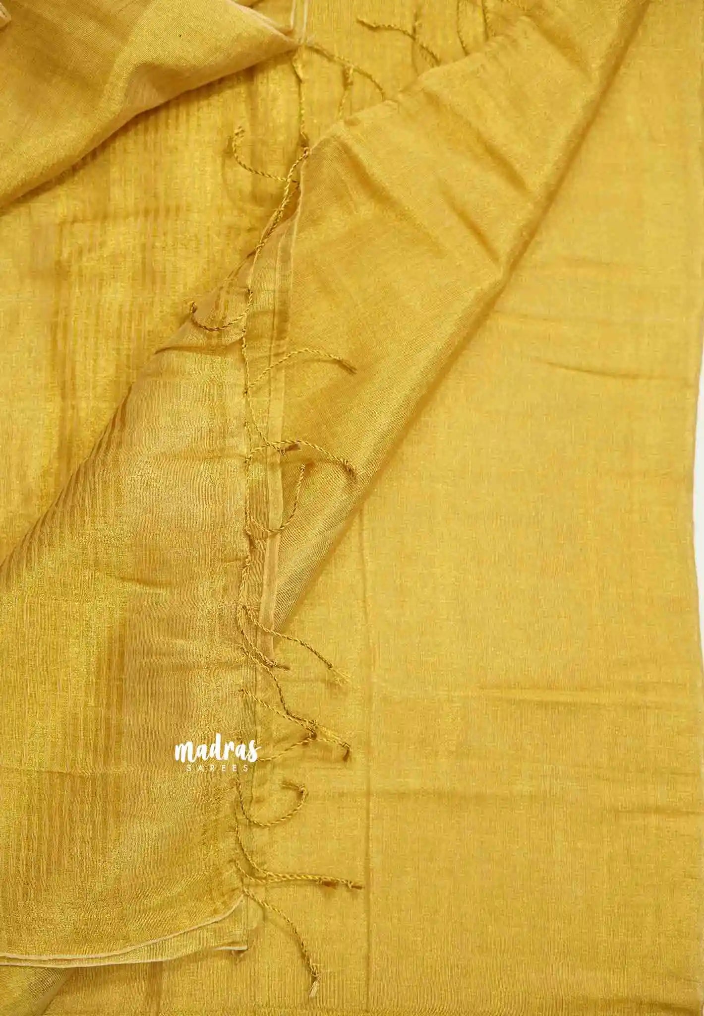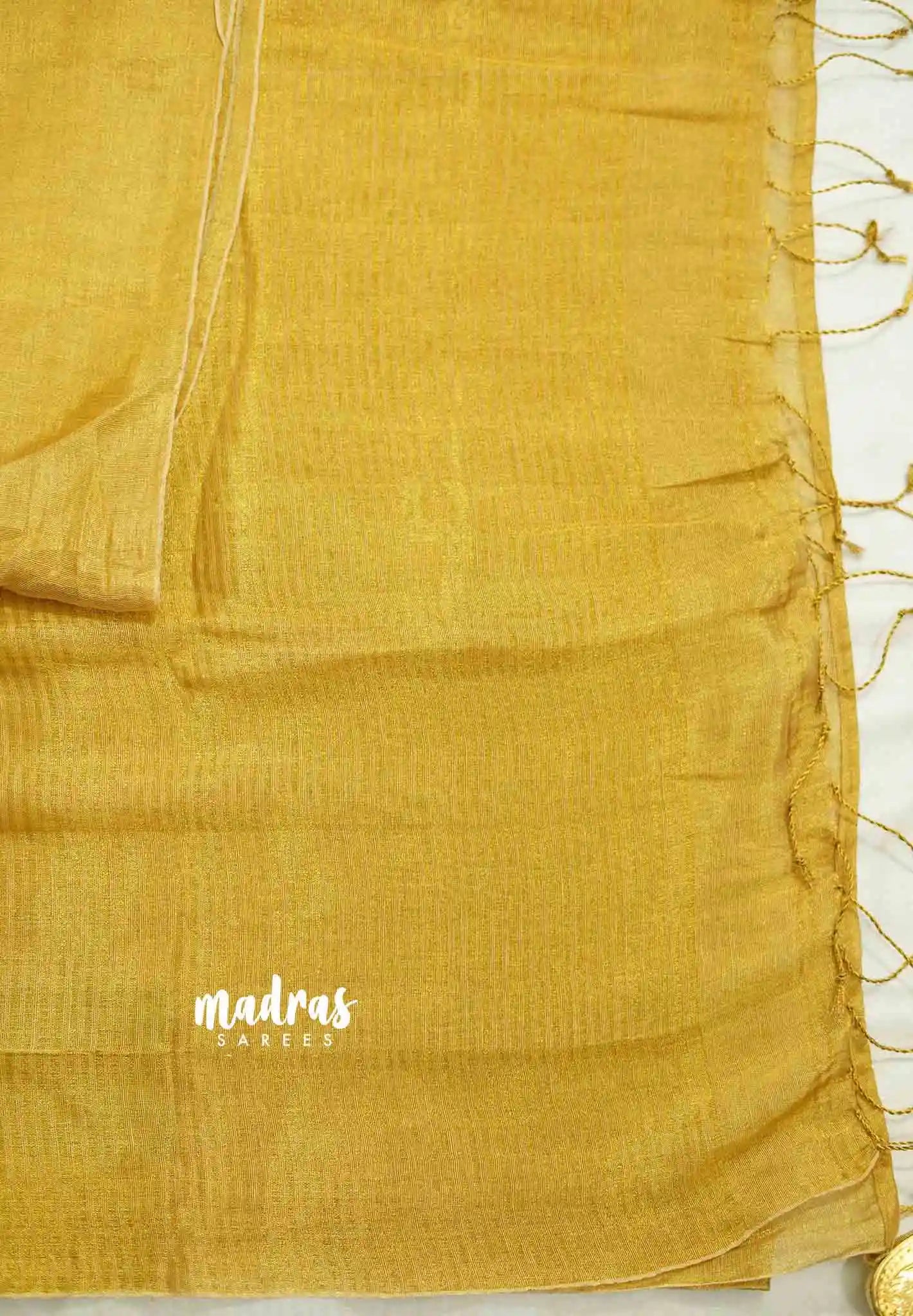 An organic tissue linen saree is made from high-quality, eco-friendly linen. The fabric features a soft, sheer texture with a subtle sheen, achieved through a special tissue weave. This saree is lightweight, breathable, and comfortable to wear, making it perfect for both formal and festive occasions. Its organic nature ensures sustainability, offering a blend of elegance and environmental consciousness.