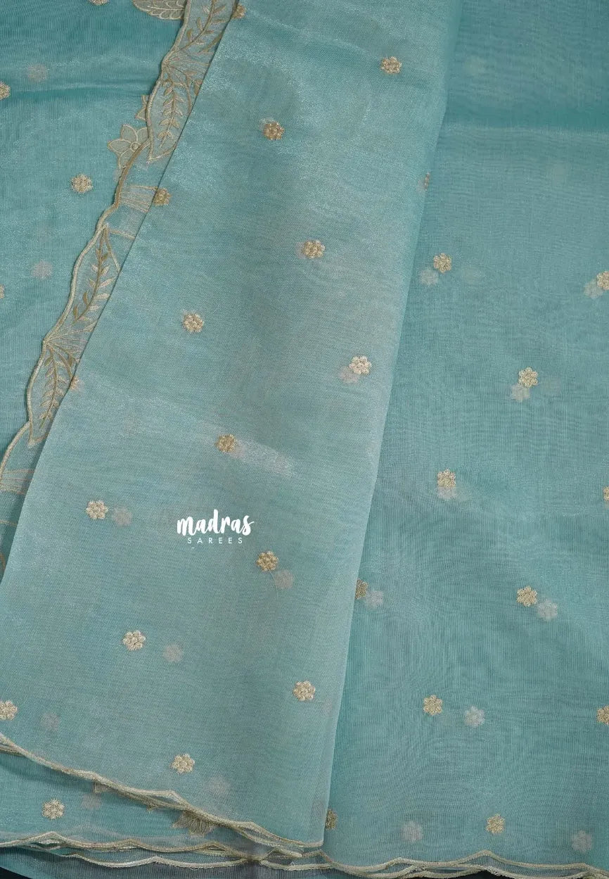 A graceful organza silk saree adorned with delicate floral embroidery all over. Lightweight and sheer, it drapes beautifully for a refined and charming look — perfect for both festive and elegant occasions.