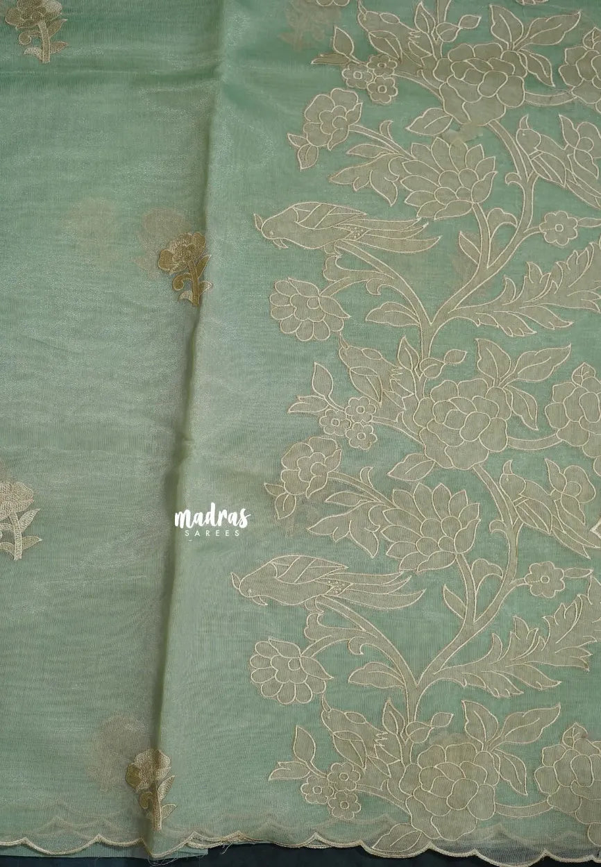 Pastel Green - Organza Silk with Small Rose Embroidery - Best for Engagements / Haldi / Reception