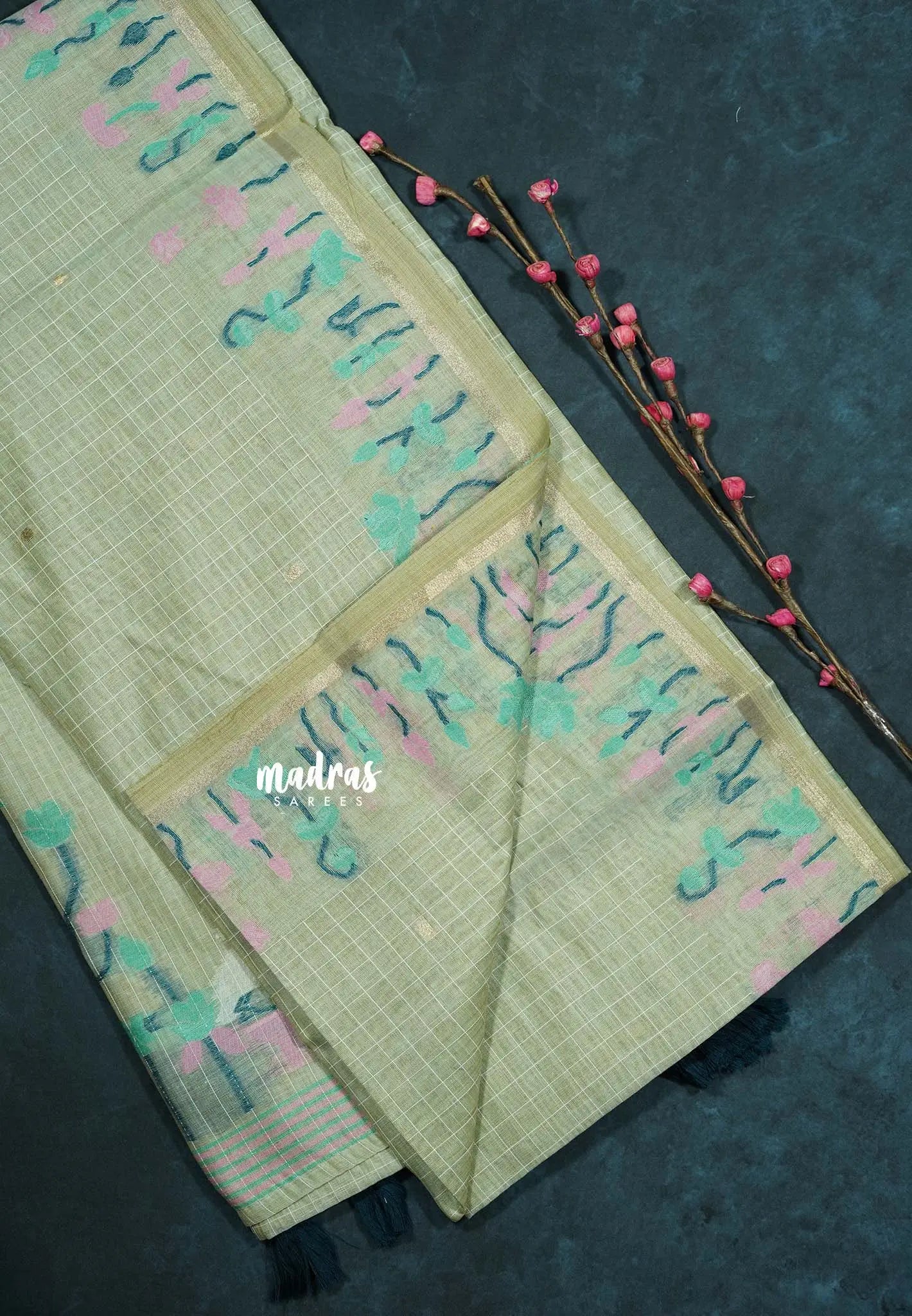 Pastel Green with Dark Green Tassels - Muslin Silk with floral Weaving Border and Pallu