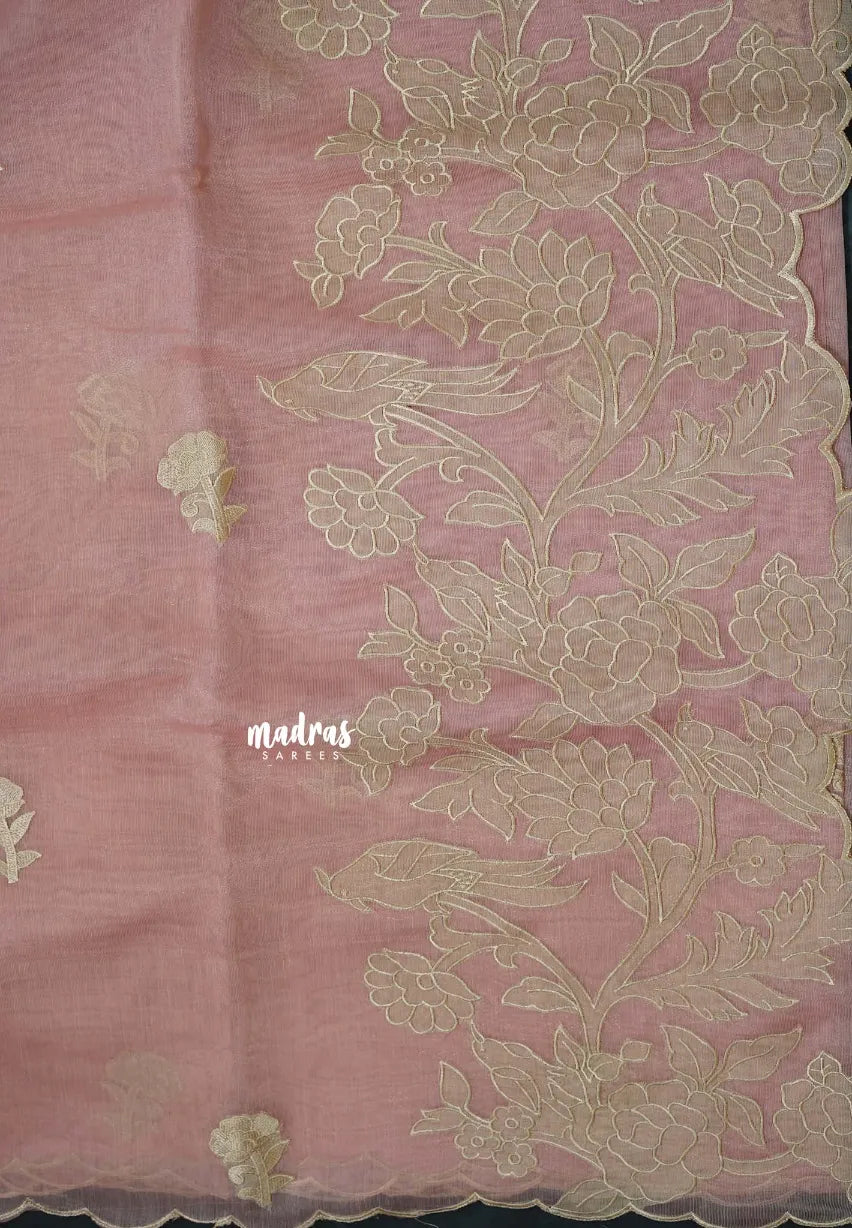 A graceful organza silk saree adorned with delicate floral embroidery all over. Lightweight and sheer, it drapes beautifully for a refined and charming look — perfect for both festive and elegant occasions.