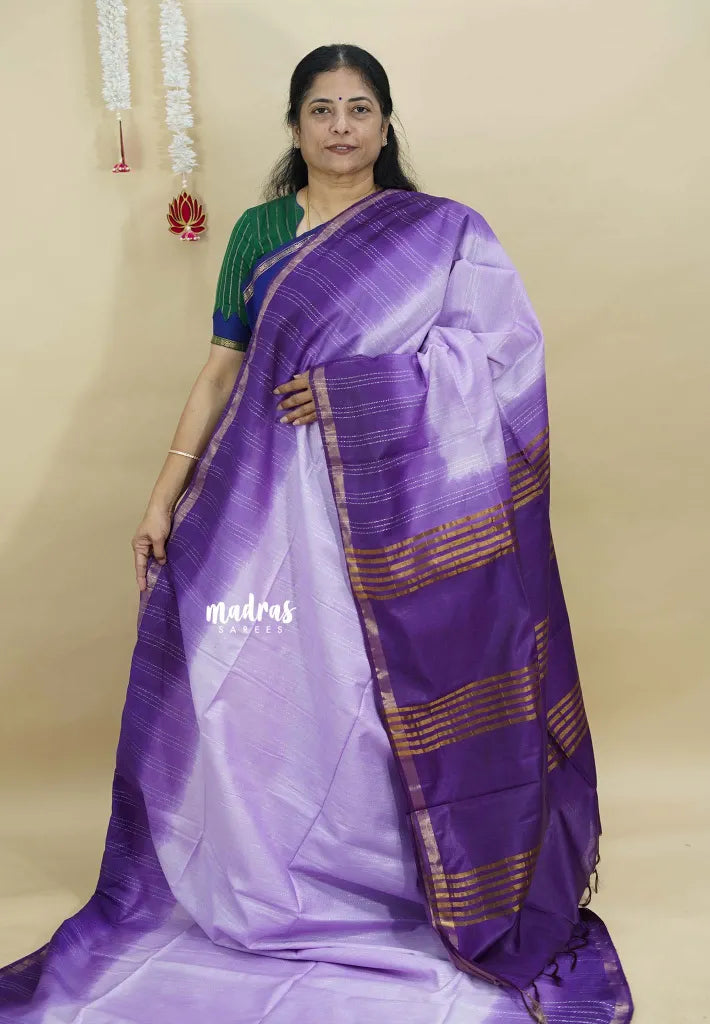 A semi-Tussar saree is made from a blend of Tussar silk and other fabrics, offering a lighter and more affordable alternative to pure Tussar silk. It has a natural sheen, soft texture, and is known for its elegant drape, making it perfect for both casual and festive occasions. Its intricate weaving and vibrant designs make it a versatile, timeless piece.