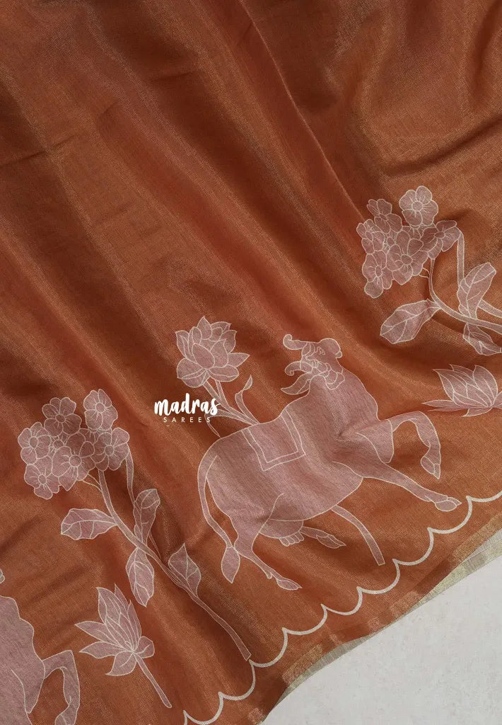 The Tissue linen absolutely stunning for high-profile parties and special occasions. The fabric’s inherent shimmer and lightness make it ideal for adding a touch of glamour. This saree features a high-quality one-side print, giving it a refined, premium finish that stands out effortlessly