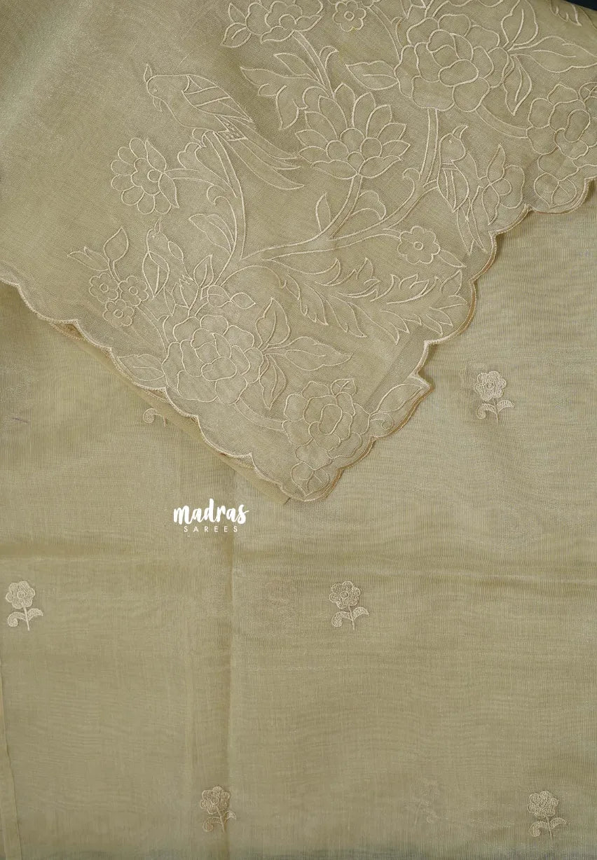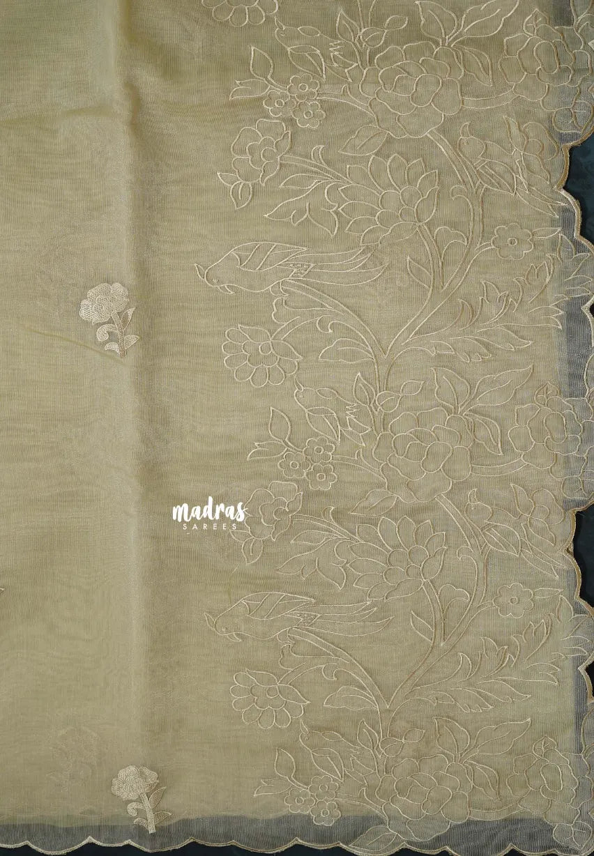 A graceful organza silk saree adorned with delicate floral embroidery all over. Lightweight and sheer, it drapes beautifully for a refined and charming look — perfect for both festive and elegant occasions.