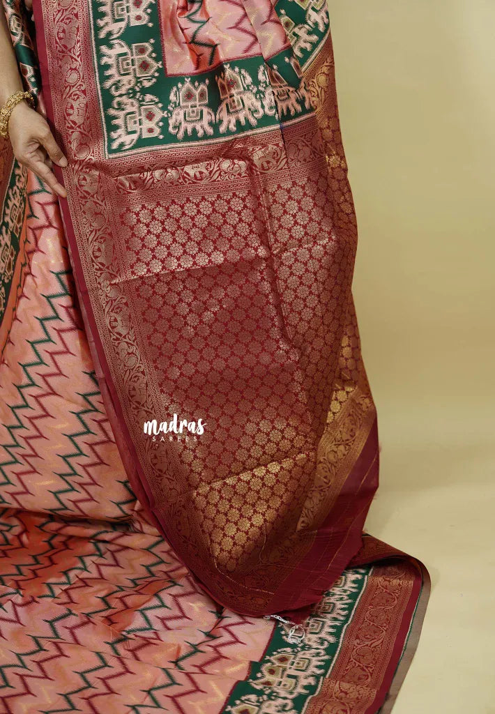 Kanchi semi Silk Saree with grand intregate pattern weaving all over the body. Semi silk sarees represent modern variations of classic silk sarees influenced by the need for luxury and comfort in silk sarees at very affordable prices.