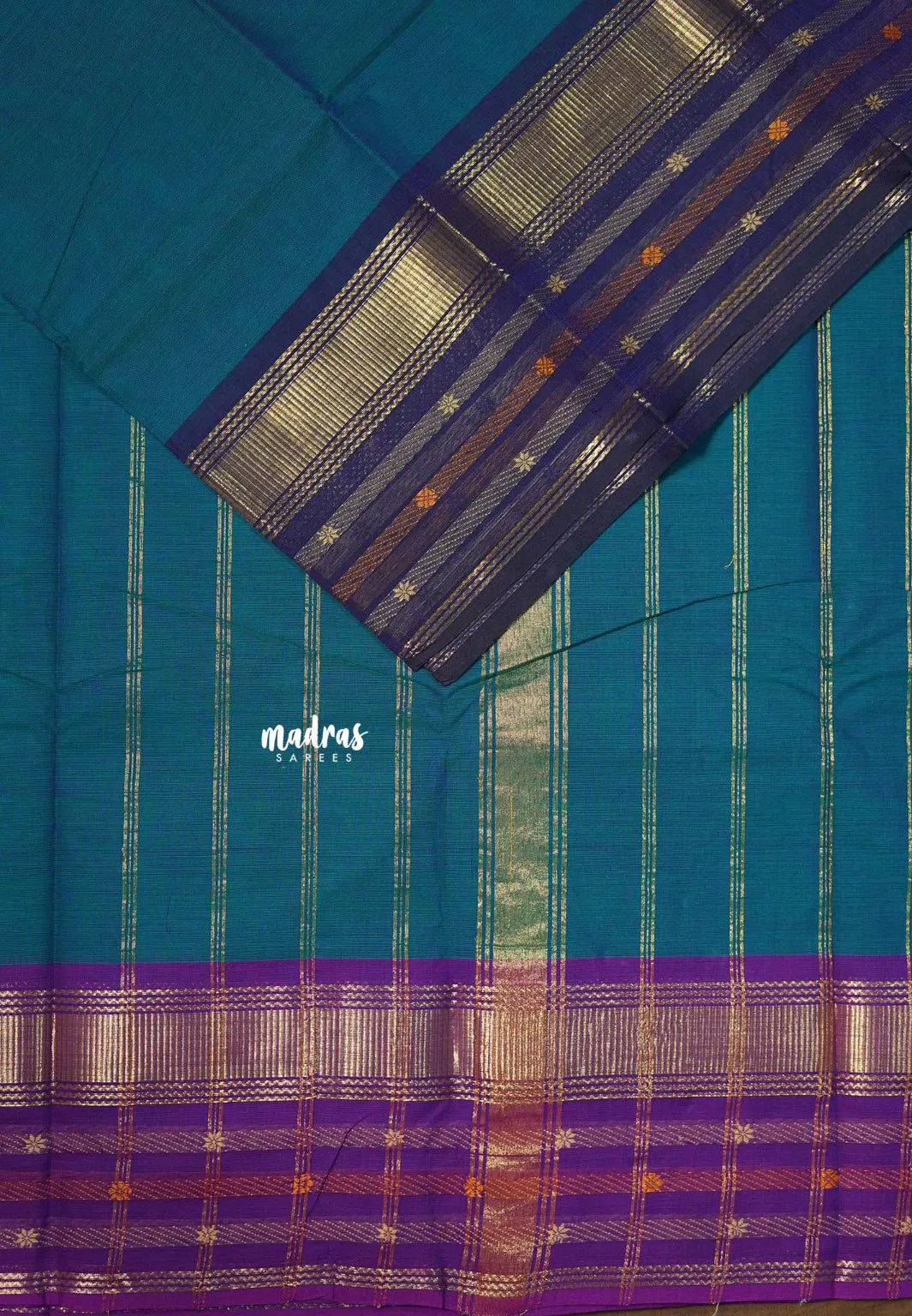 Peacock Blue - Karthigai silk cotton plain body with multi line Ganga jamuna border - Best for Gifting