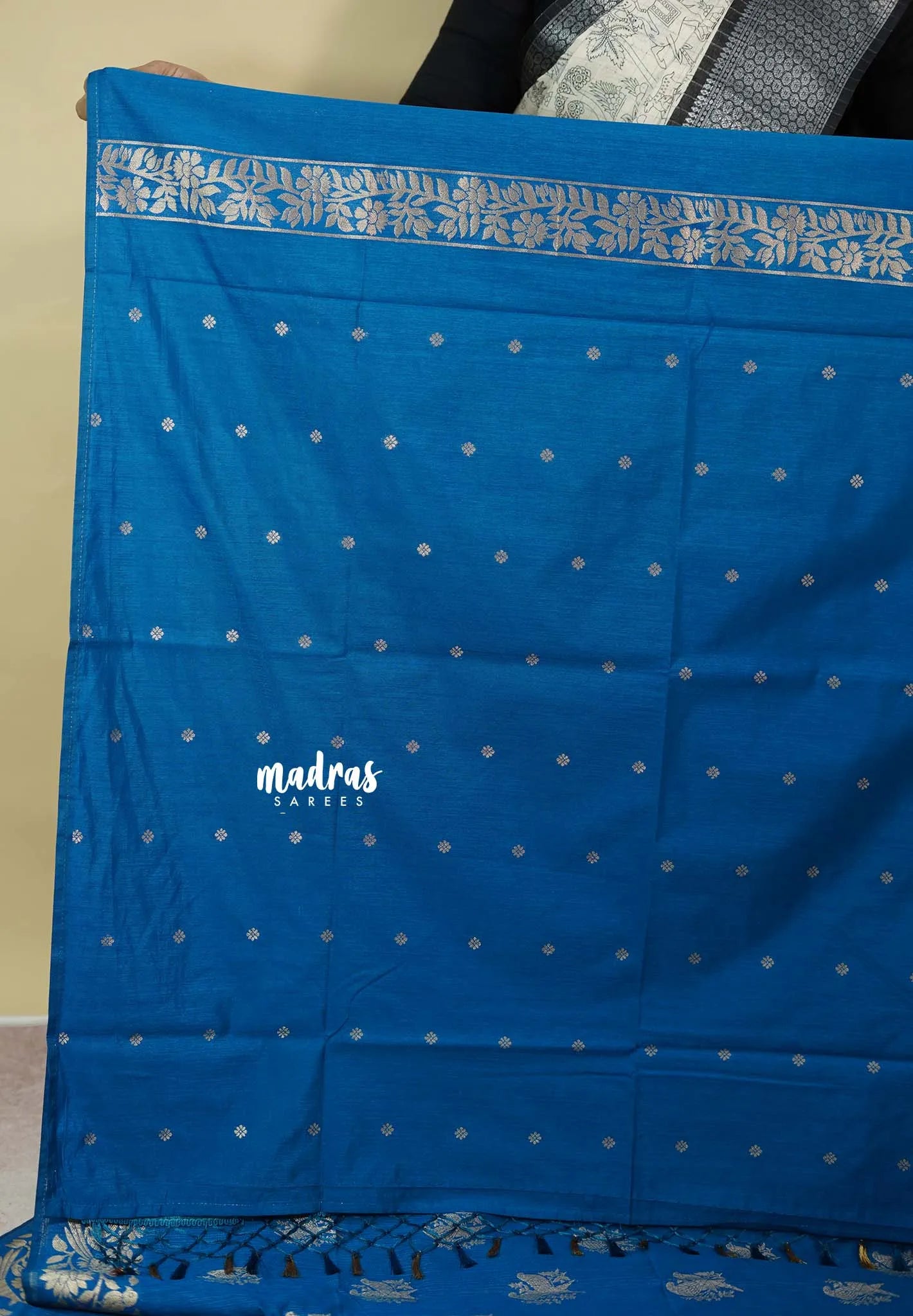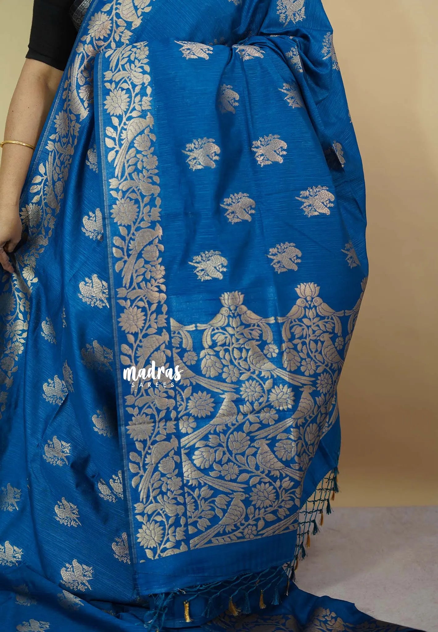 Peacock Blue - Vadhanam - Premium Jute tussar with full birds weaving buttas and border