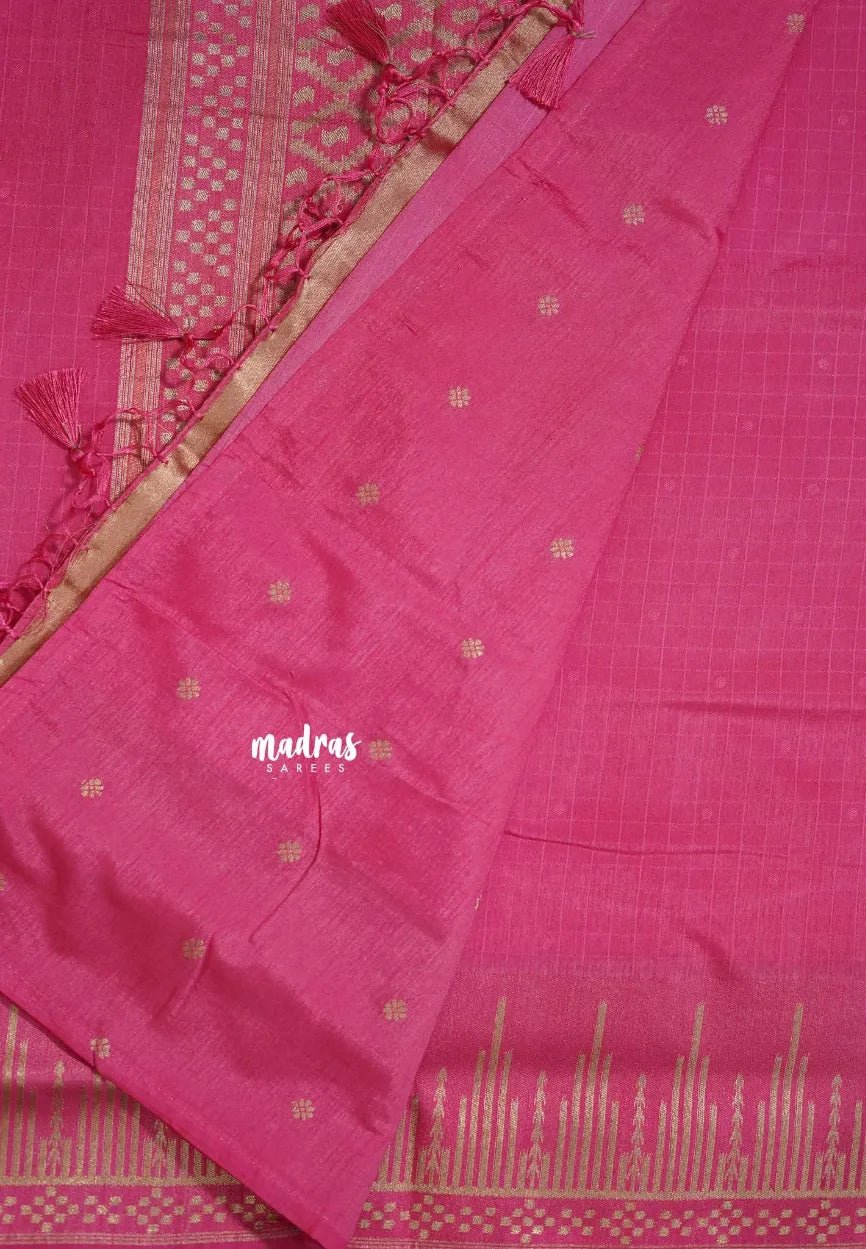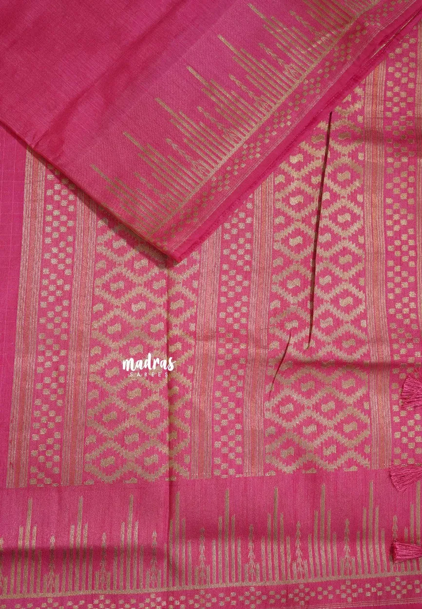 Pink - Raaga - Raw Mango Tussar Silk with Stripe Temple Border and Piping - Best for Pooja Days