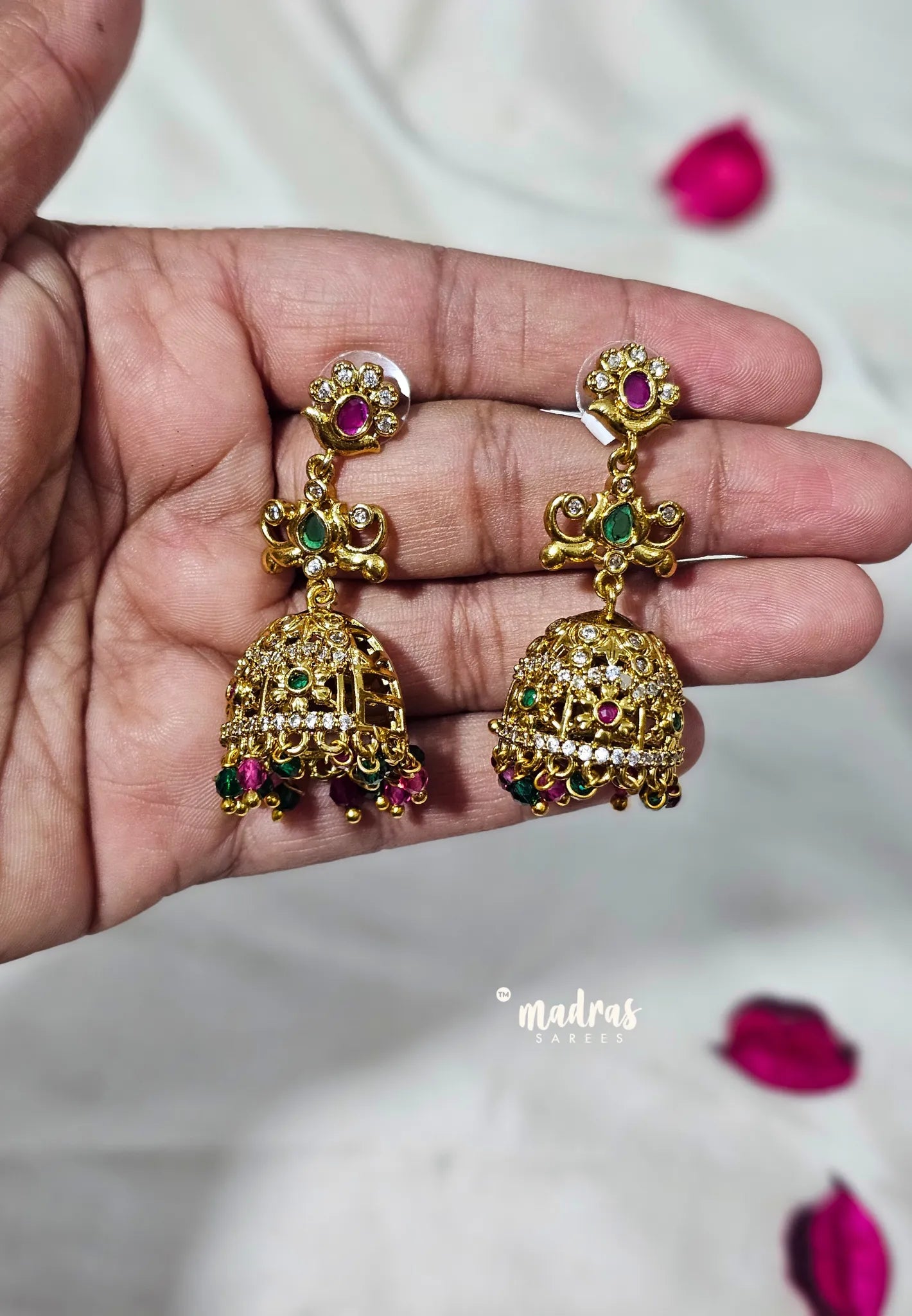 Premium 1 Gram Gold polish AD Stone Trendy Antique Temple Jhumka Earrings