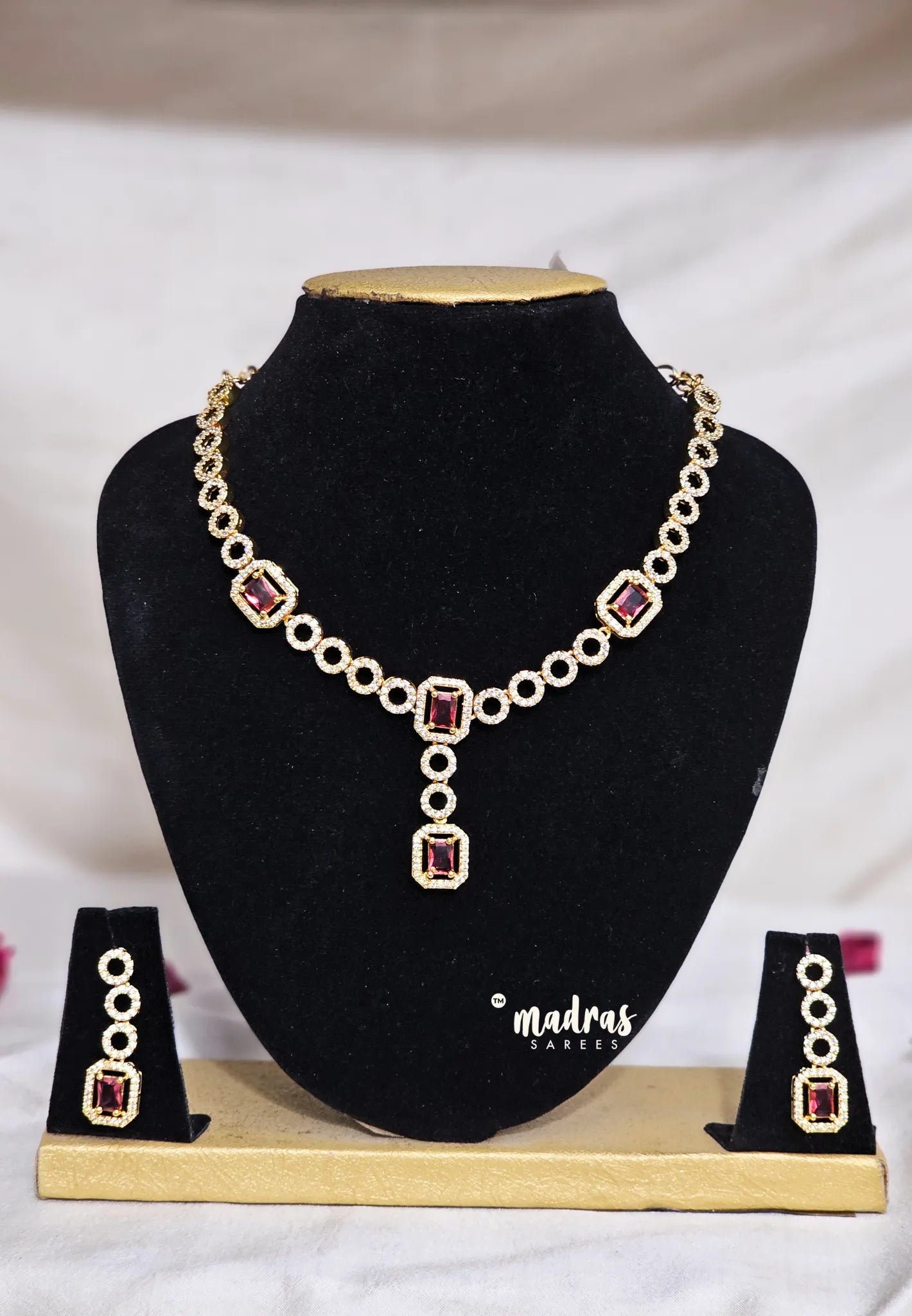 Premium 1 Gram Gold polish AD Stone Trendy Circle and Square Designer Ruby Necklace with Earrings