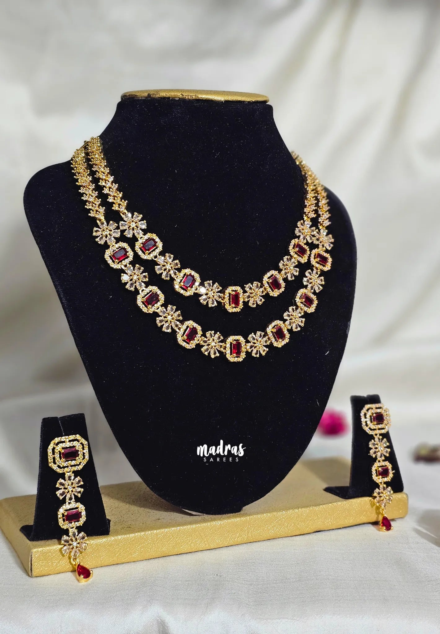 Premium 1 Gram Gold polish AD Stone Trendy double layer Ruby Stone Necklace with Earrings