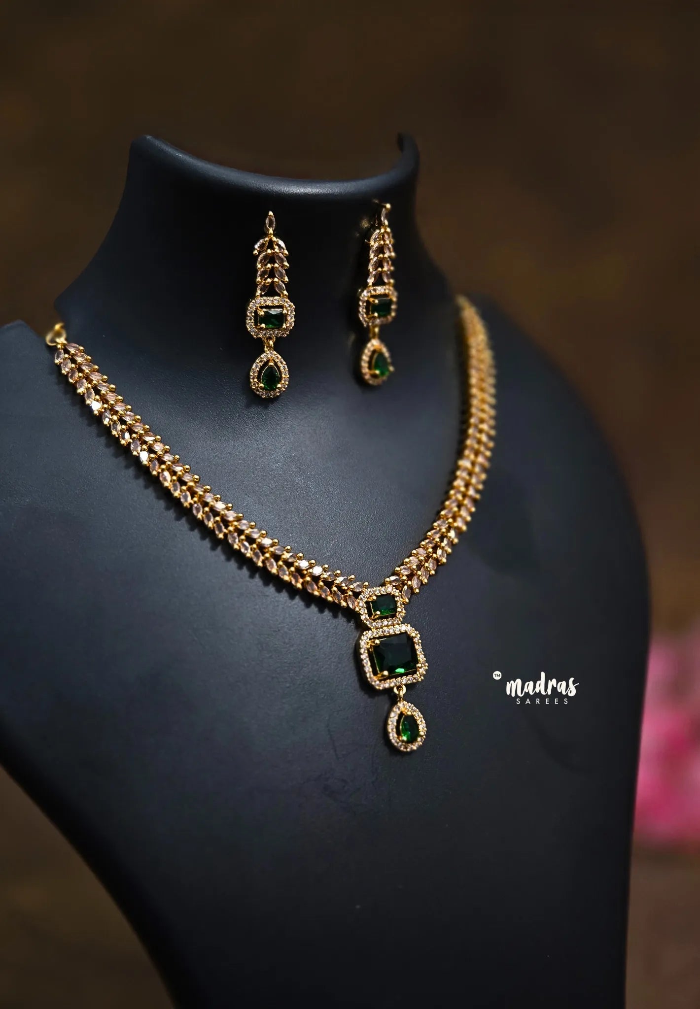 Premium 1 Gram Gold polish AD Stone Trendy Emerald and Leaf Pattern Necklace with Earrings
