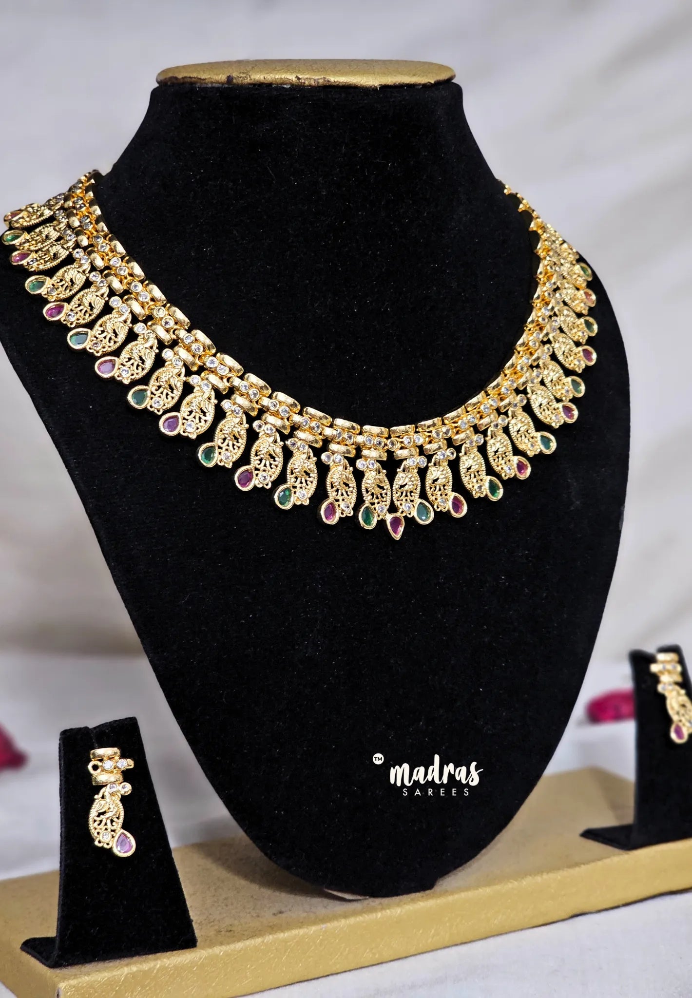 Premium 1 Gram Gold polish AD Stone Trendy Green and Ruby Peacock white gold Necklace with Earrings