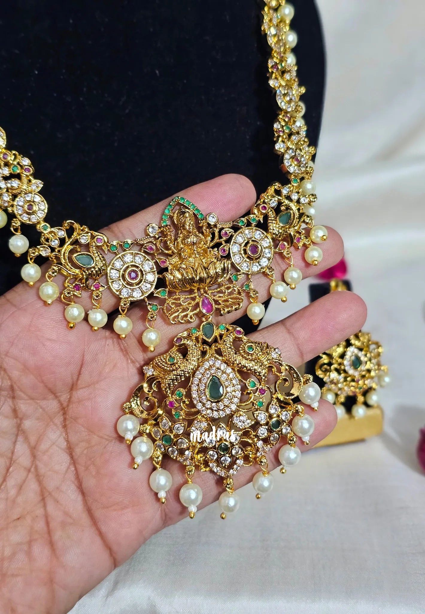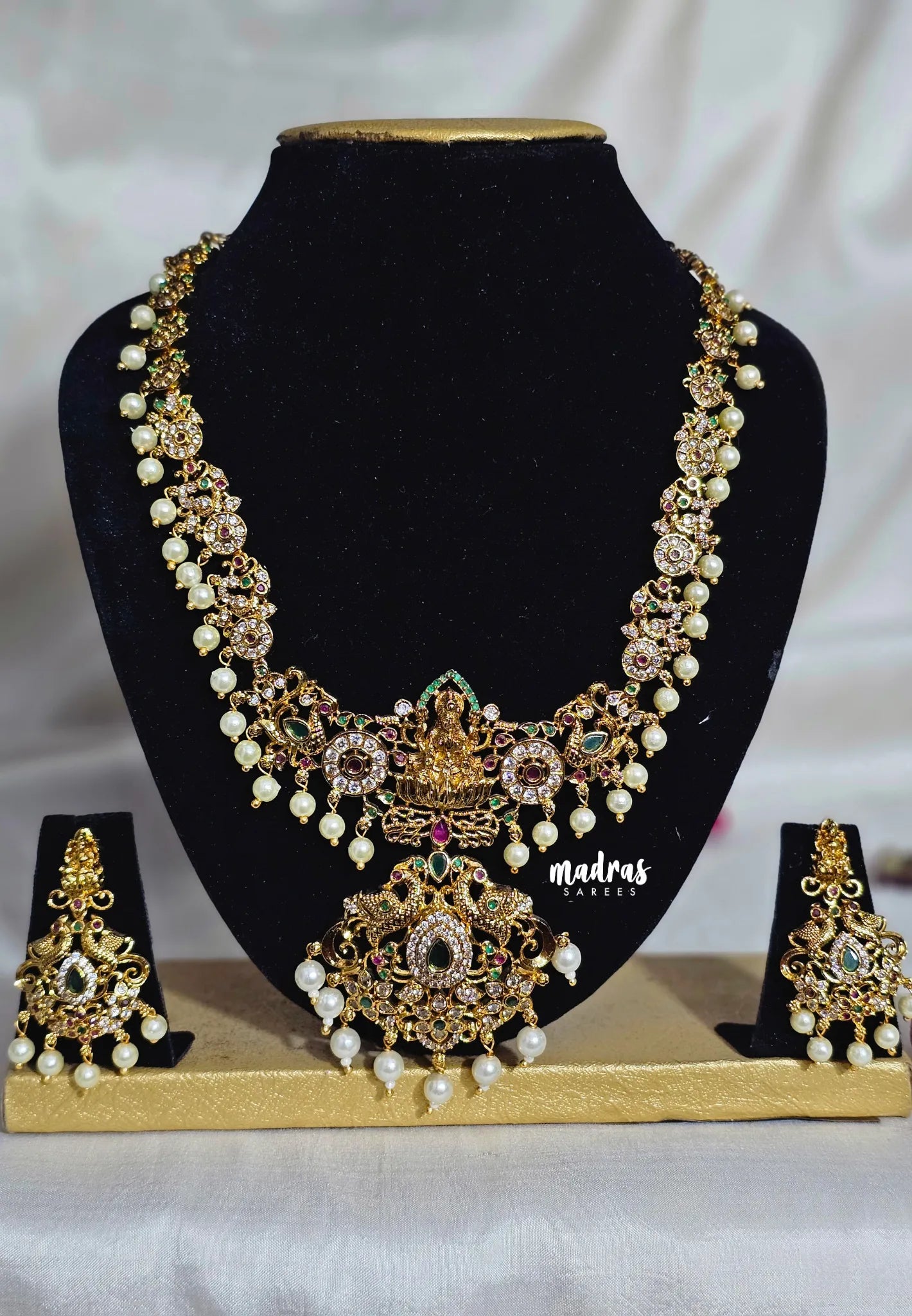 Premium 1 Gram Gold polish AD Stone Trendy Lakshmi Pendant Bridal long Necklace with Earrings