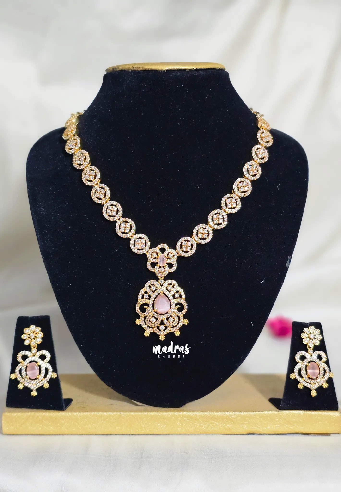 Premium 1 Gram Gold polish AD Stone Trendy Baby Pink Stone Necklace with Earrings