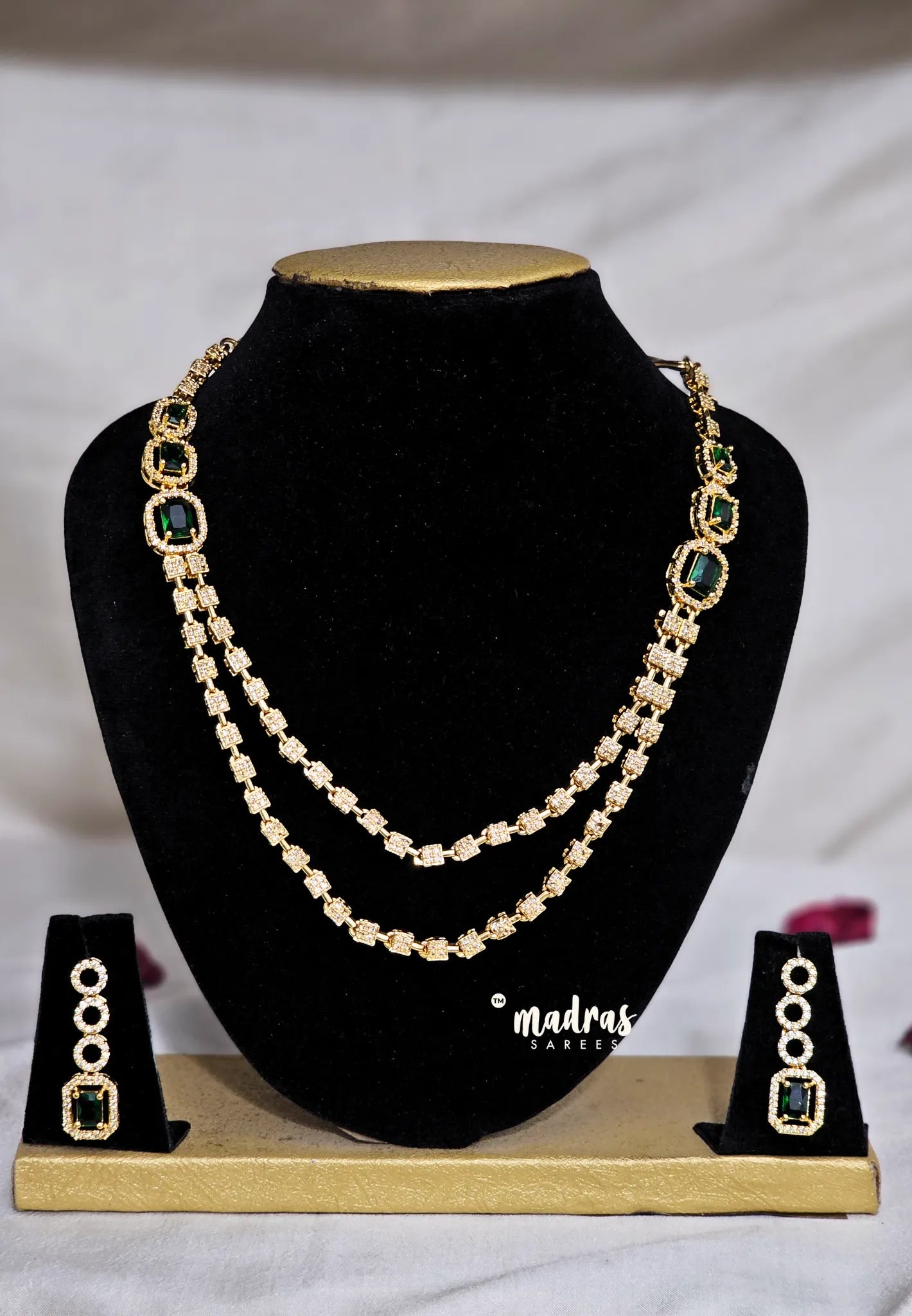 Premium 1 Gram Gold polish AD Stone Trendy double layer Emerald Necklace with Earrings