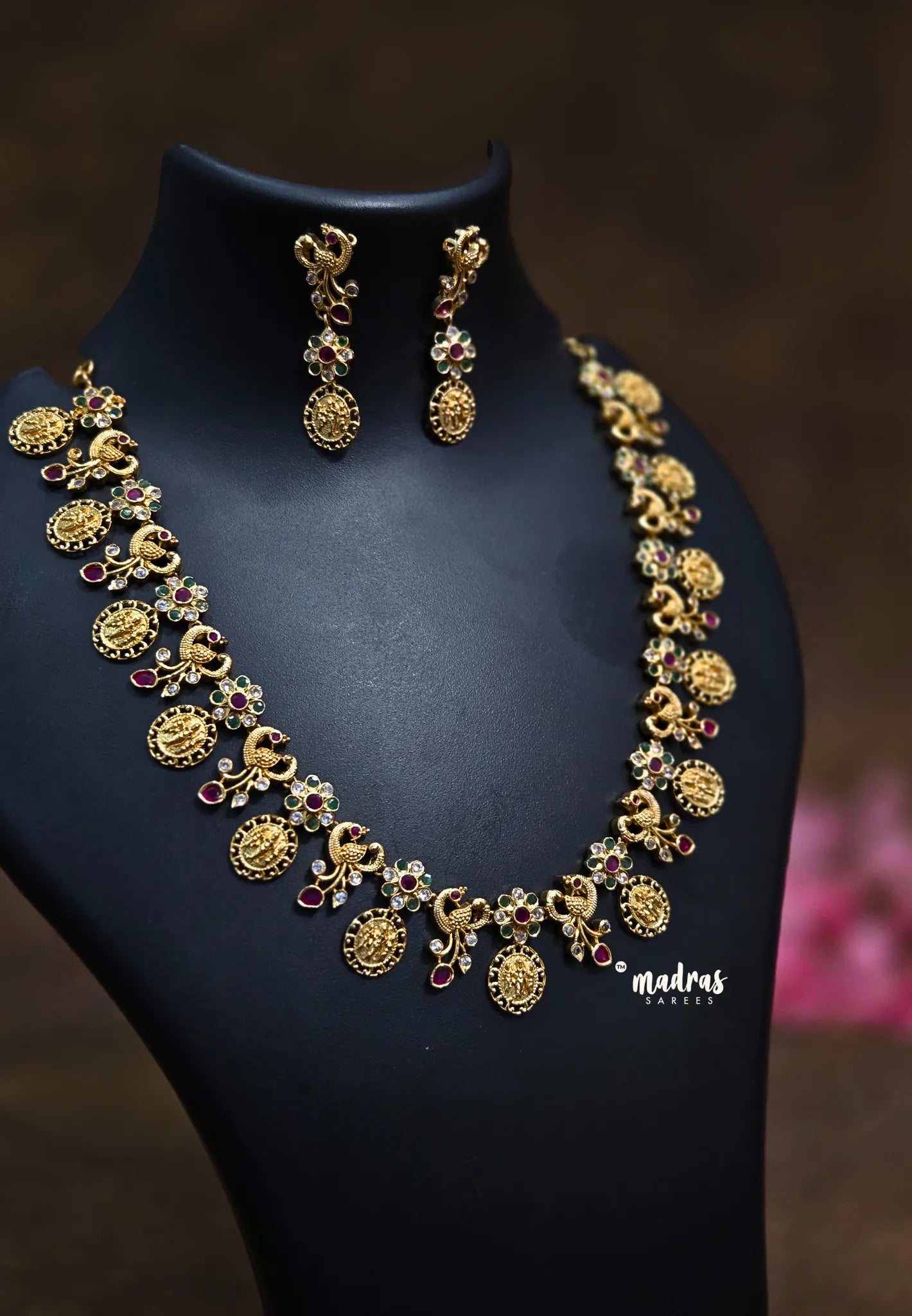 Premium 1 Gram Gold polish AD Stone trendy Ram Parivar and Peacock Necklace with Earrings