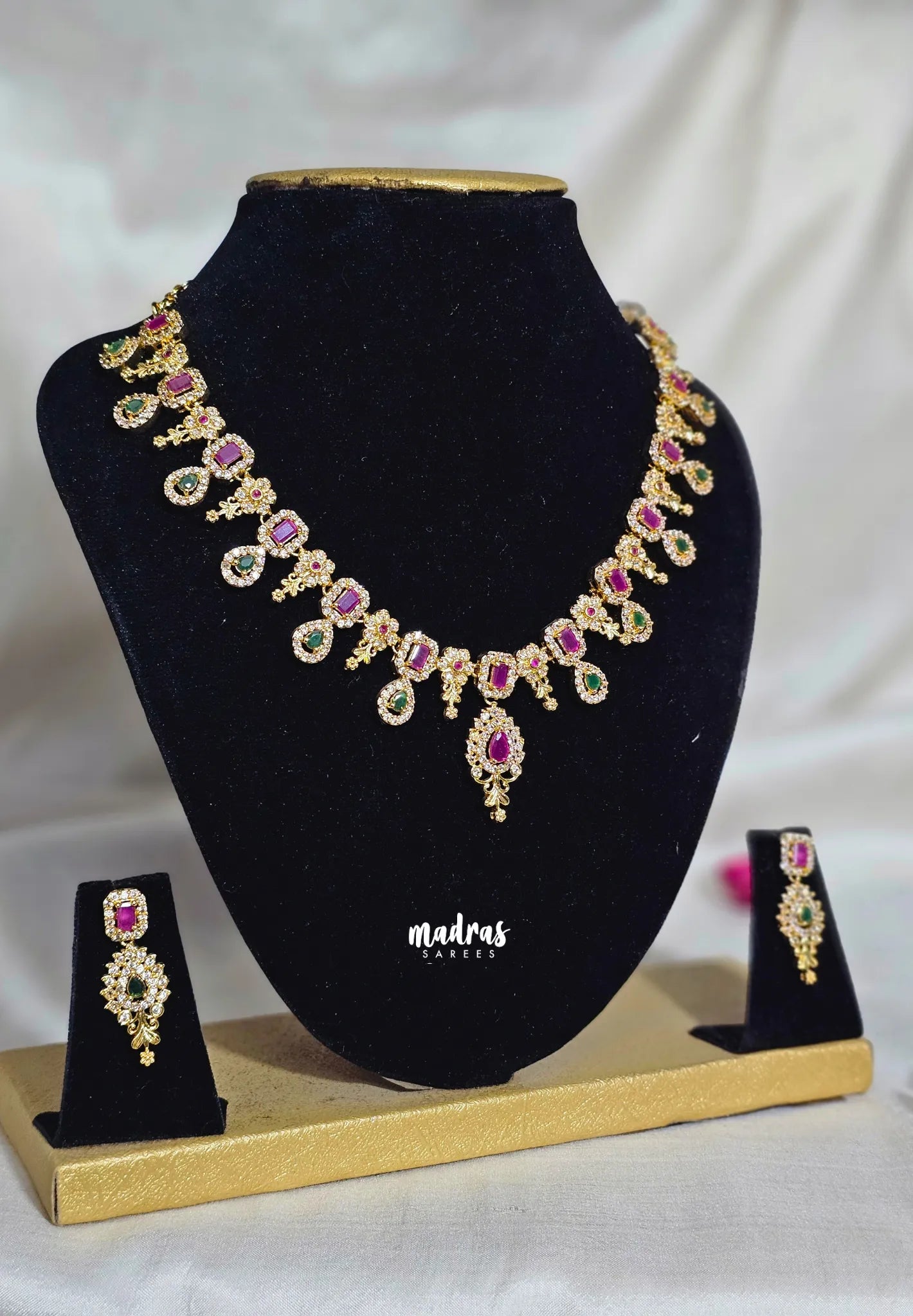 Premium 1 Gram Gold polish AD Stone Trendy Ruby and Green Necklace with Earrings
