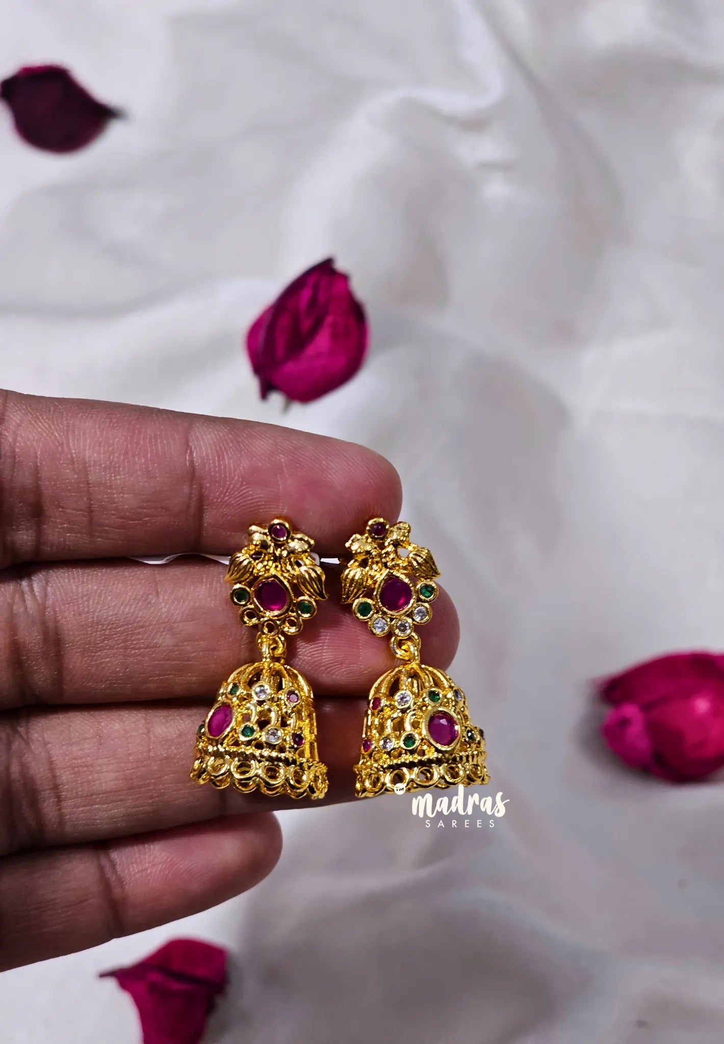 Premium 1 Gram Gold polish AD Stone Trendy Temple Jhumka Earrings