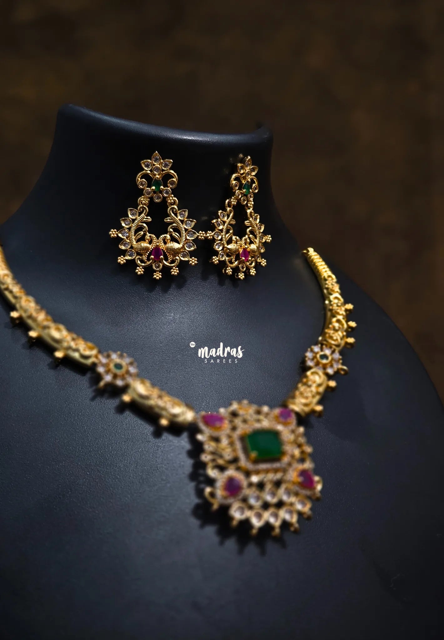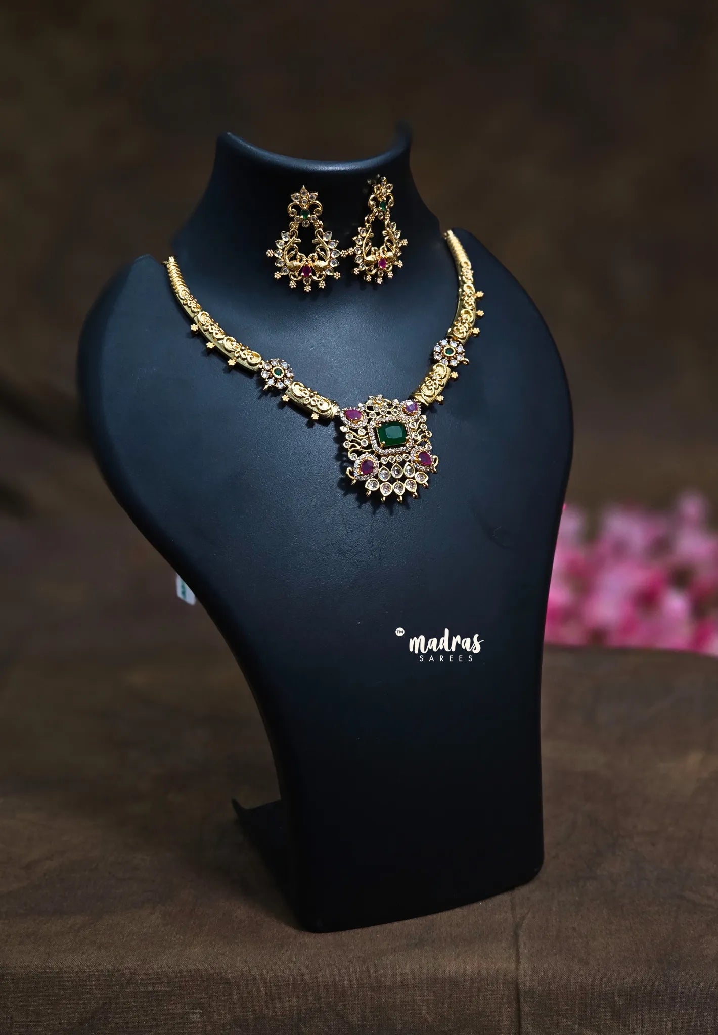 Premium 1 Gram Gold polish AD Stone Trendy Temple Necklace with Earrings