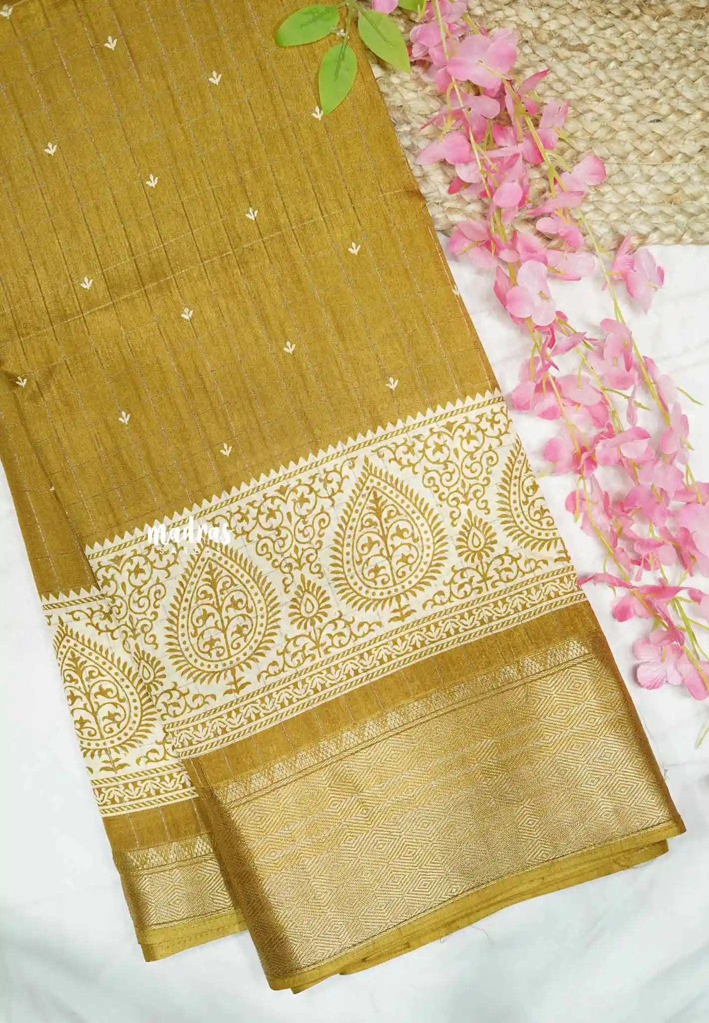 Premium printed silk checks weaving thilagam border - yellow ochre