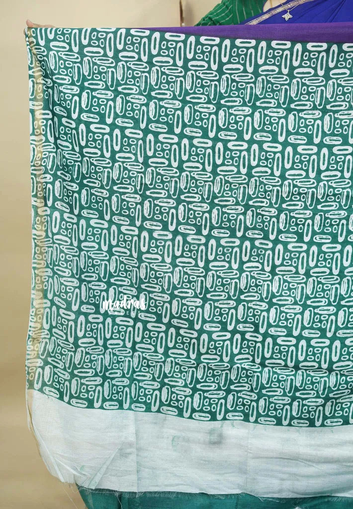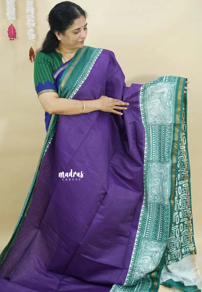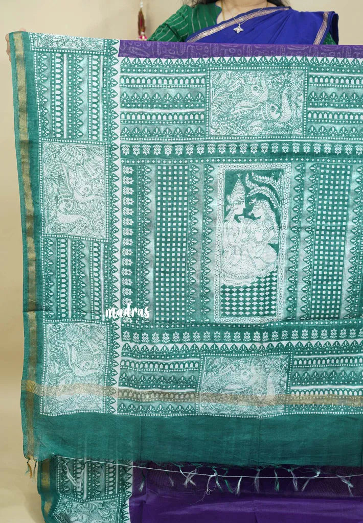 Purple with Green - Chanderi cotton silk Plain Saree with Madhubani Prints Pallu