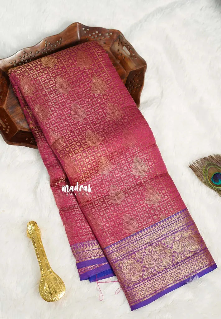 Kanchi semi Silk Saree with grand intregate buttas weaving all over the body. Semi silk sarees represent modern variations of classic silk sarees influenced by the need for luxury and comfort in silk sarees at very affordable prices.