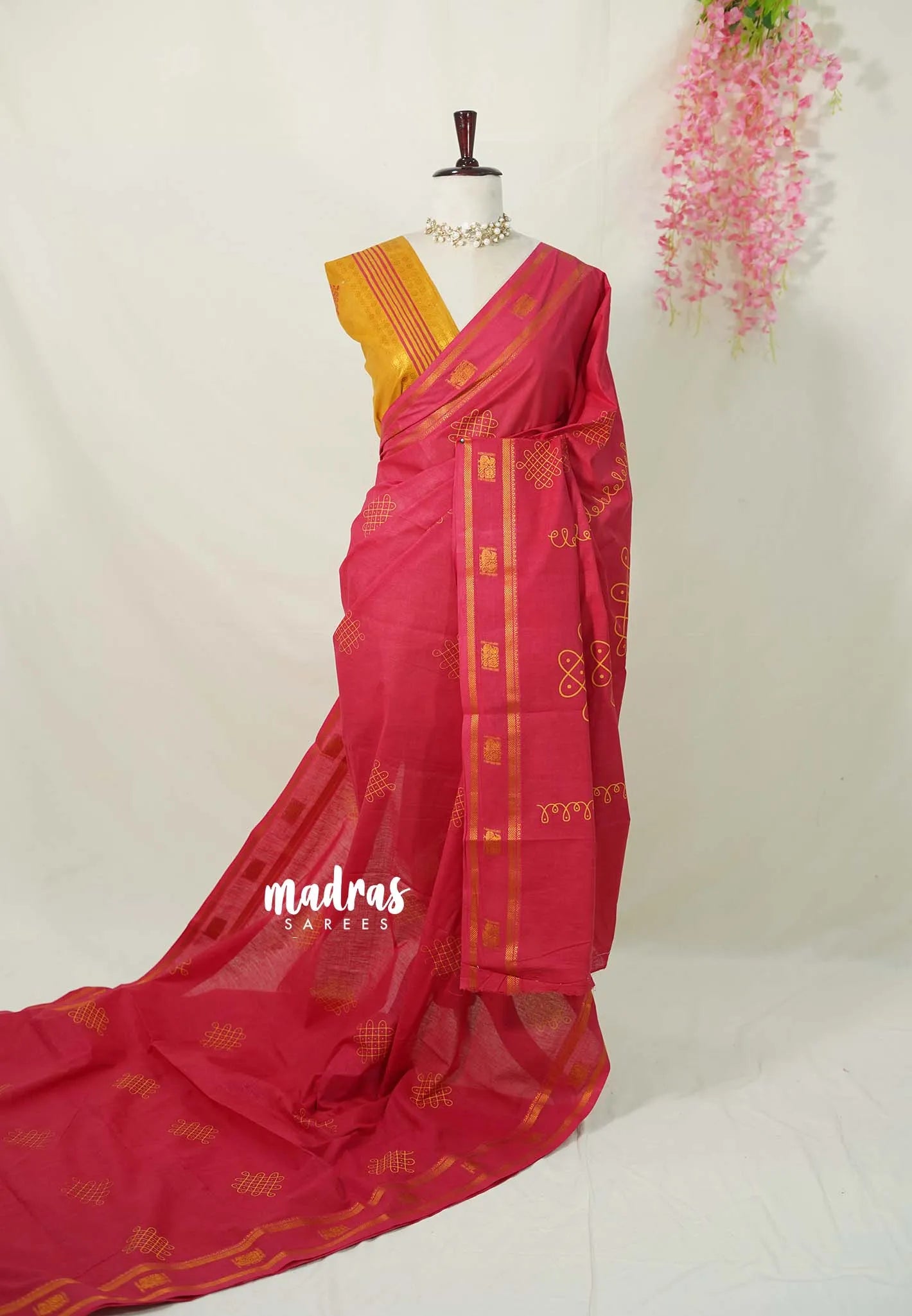 Reddish Pink - Subbulakshmi - Sungudi 100 Count Saree Kolam Prints with Peacock Border with Blouse Combo - Best for Casual Wear | Summer Wear | Temple visit