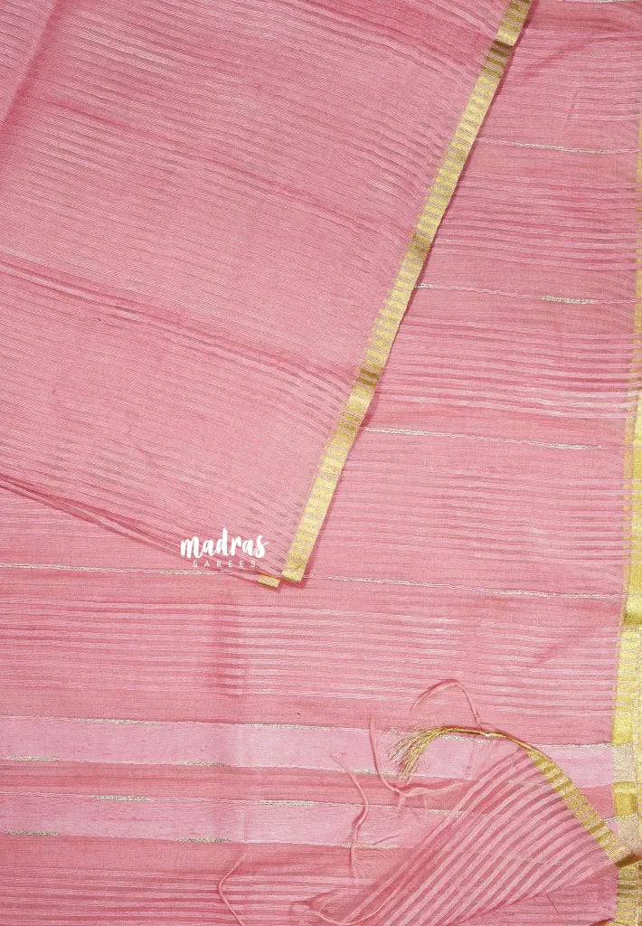 A graceful semi tussar saree featuring subtle textured stripes all over the body. The rich zari border adds a touch of elegance, making it perfect for both festive and classy occasions.