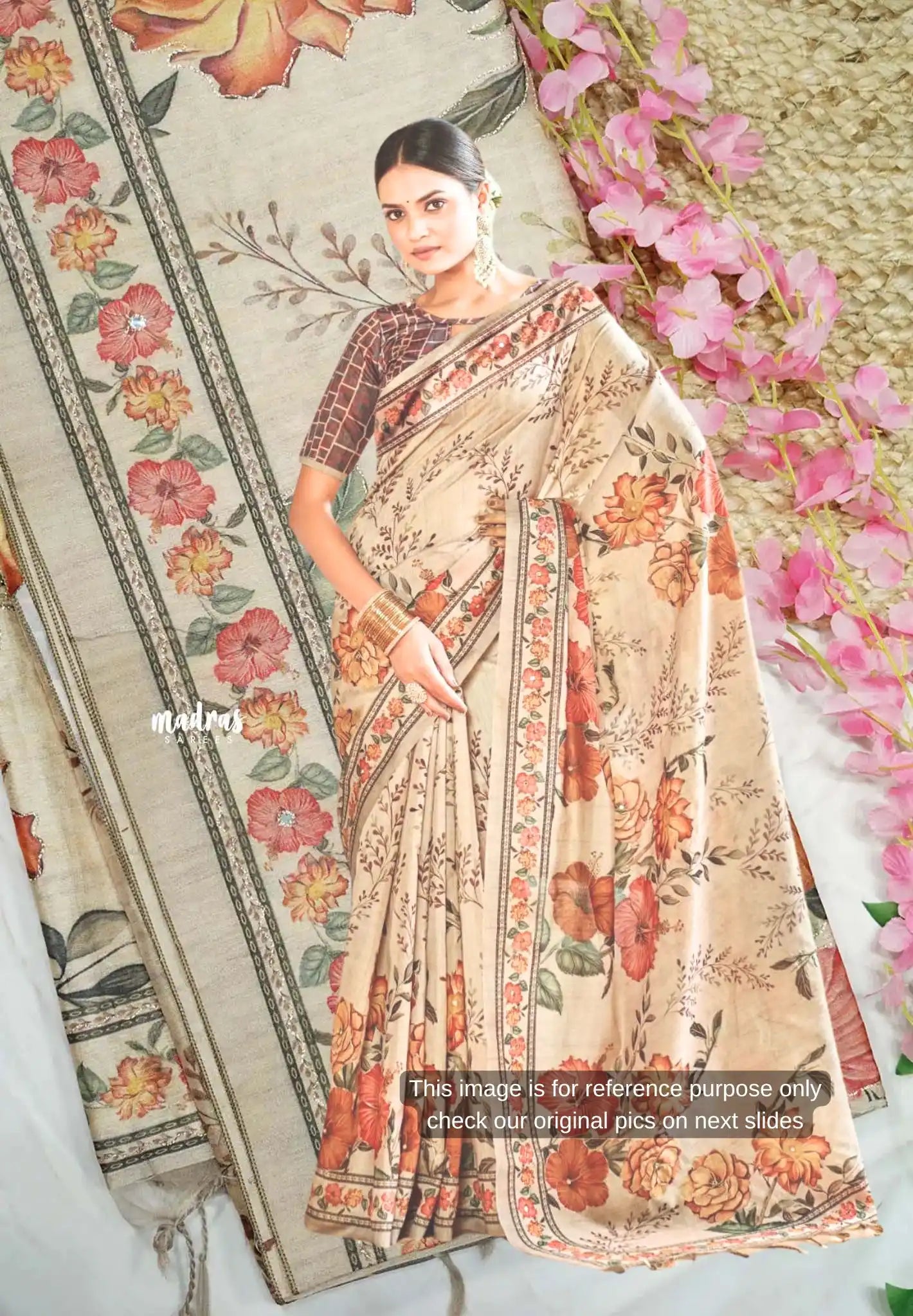 Roopa - Premium Chappa semi tussar floral prints with embroidery outline - Beige