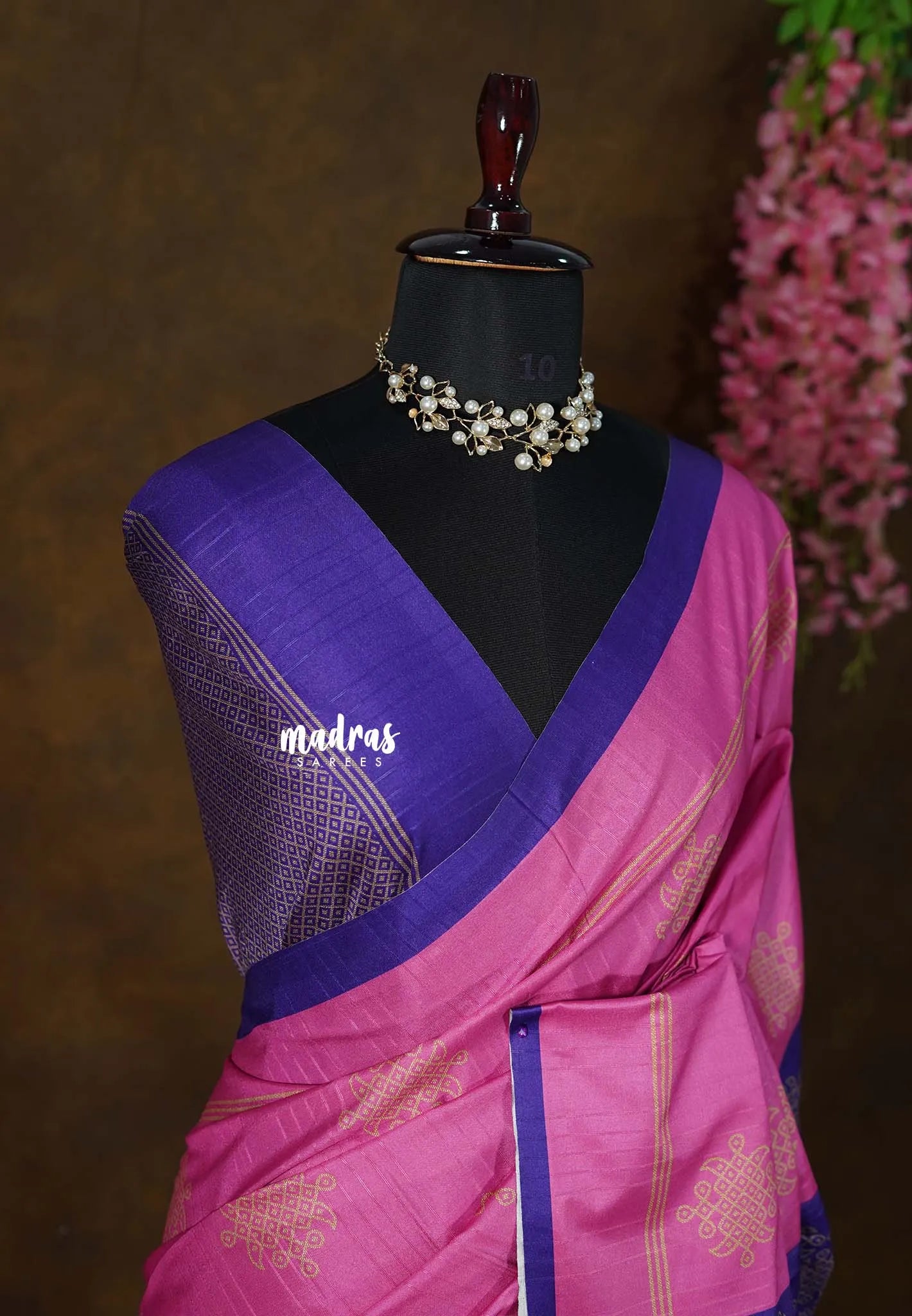 Chithiram –  Rose Pink in Soft Paper Silk | Intricate Kolam Prints  | Statement Contrast Pallu & blouse | Effortless Casual Style