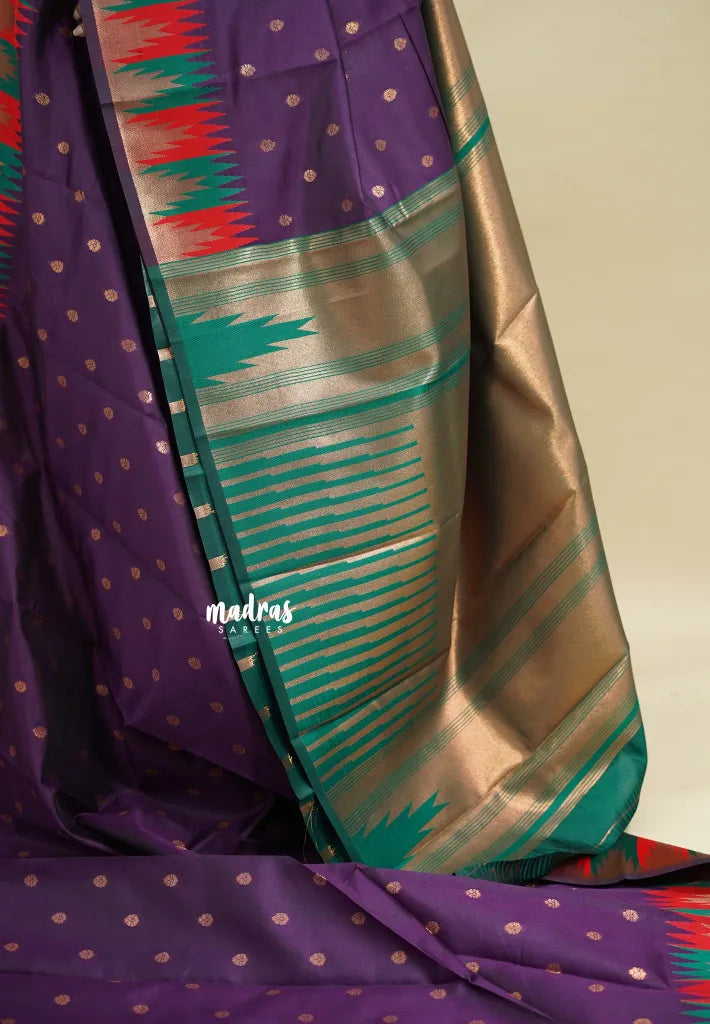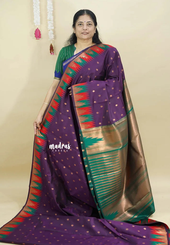Kanchi semi Silk Saree with grand intregate pattern weaving all over the body. Semi silk sarees represent modern variations of classic silk sarees influenced by the need for luxury and comfort in silk sarees at very affordable prices.