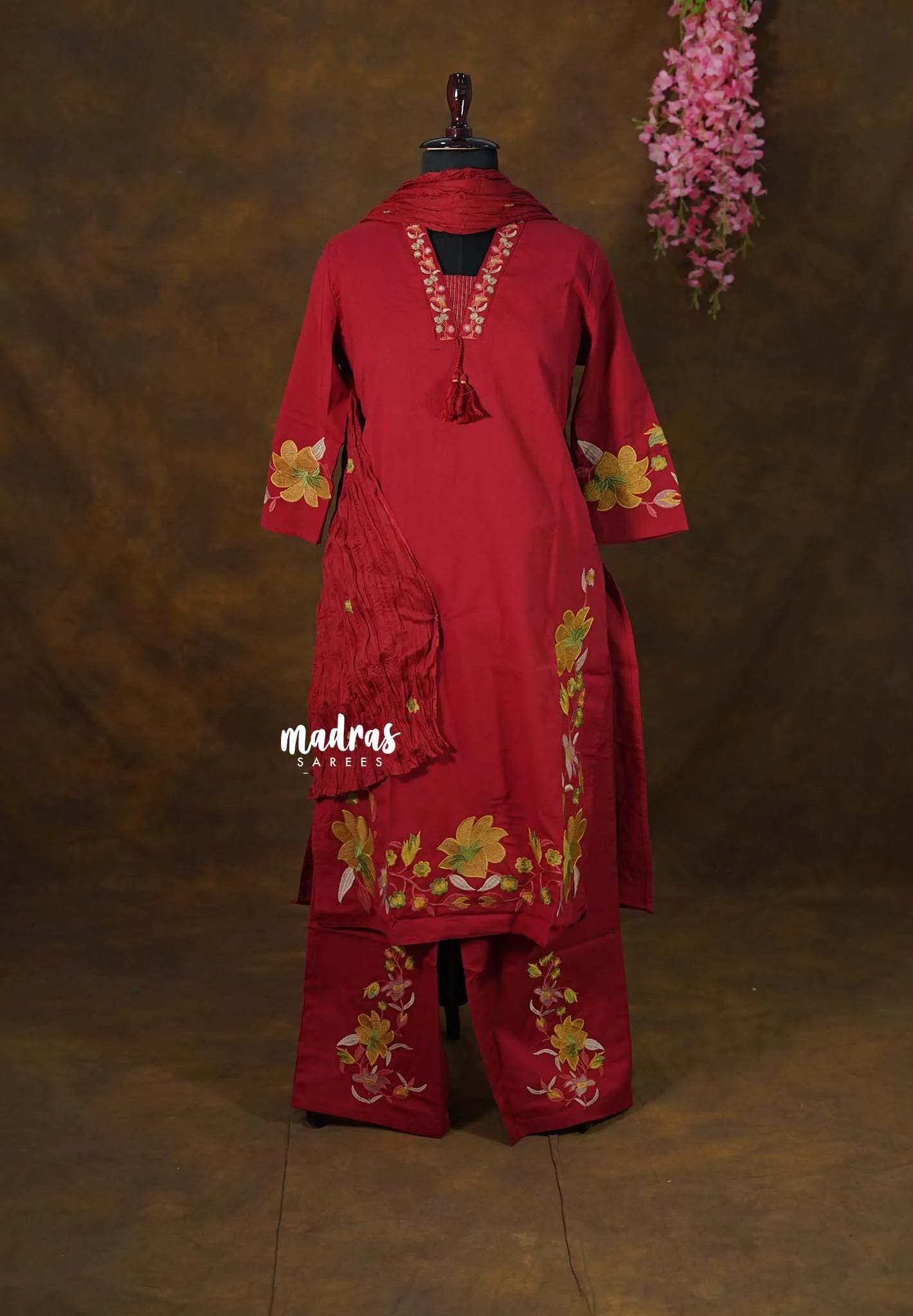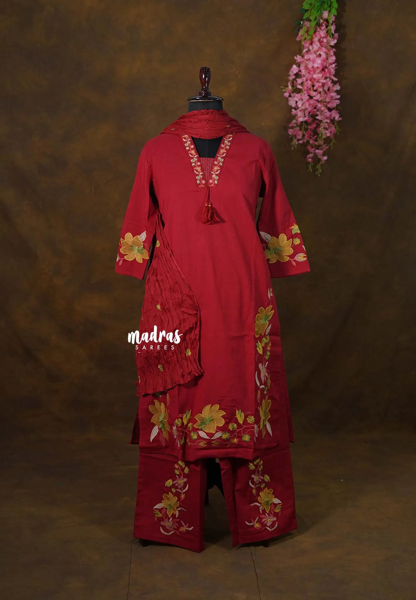 The rich red base is beautifully enhanced with elegant floral embroidery on the sleeves, hemline, and bottom, adding a refined handcrafted appeal. The subtle neckline detailing with tassel accents brings a delicate traditional touch, while the coordinated dupatta completes the look gracefully.