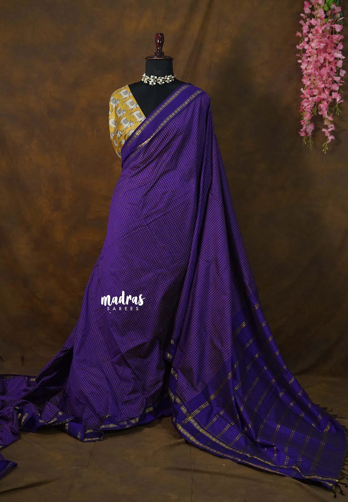 Perfectly complements the saree with its subtle checks and traditional finish.
