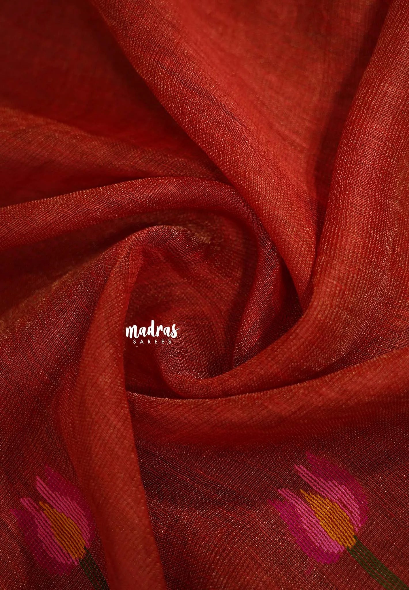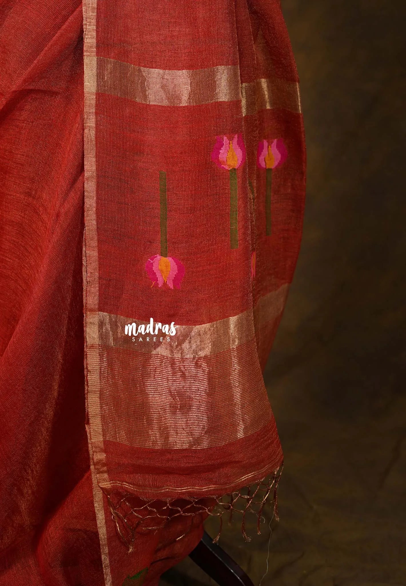 The silk-linen blend offers a perfect balance of natural sheen and breathability, making the saree lightweight, airy, and extremely comfortable for long wear. The body features subtle woven motifs, while the richly designed pallu highlights traditional patterns that add depth and character without overpowering the look. A soft, elegant border completes the saree with timeless charm.