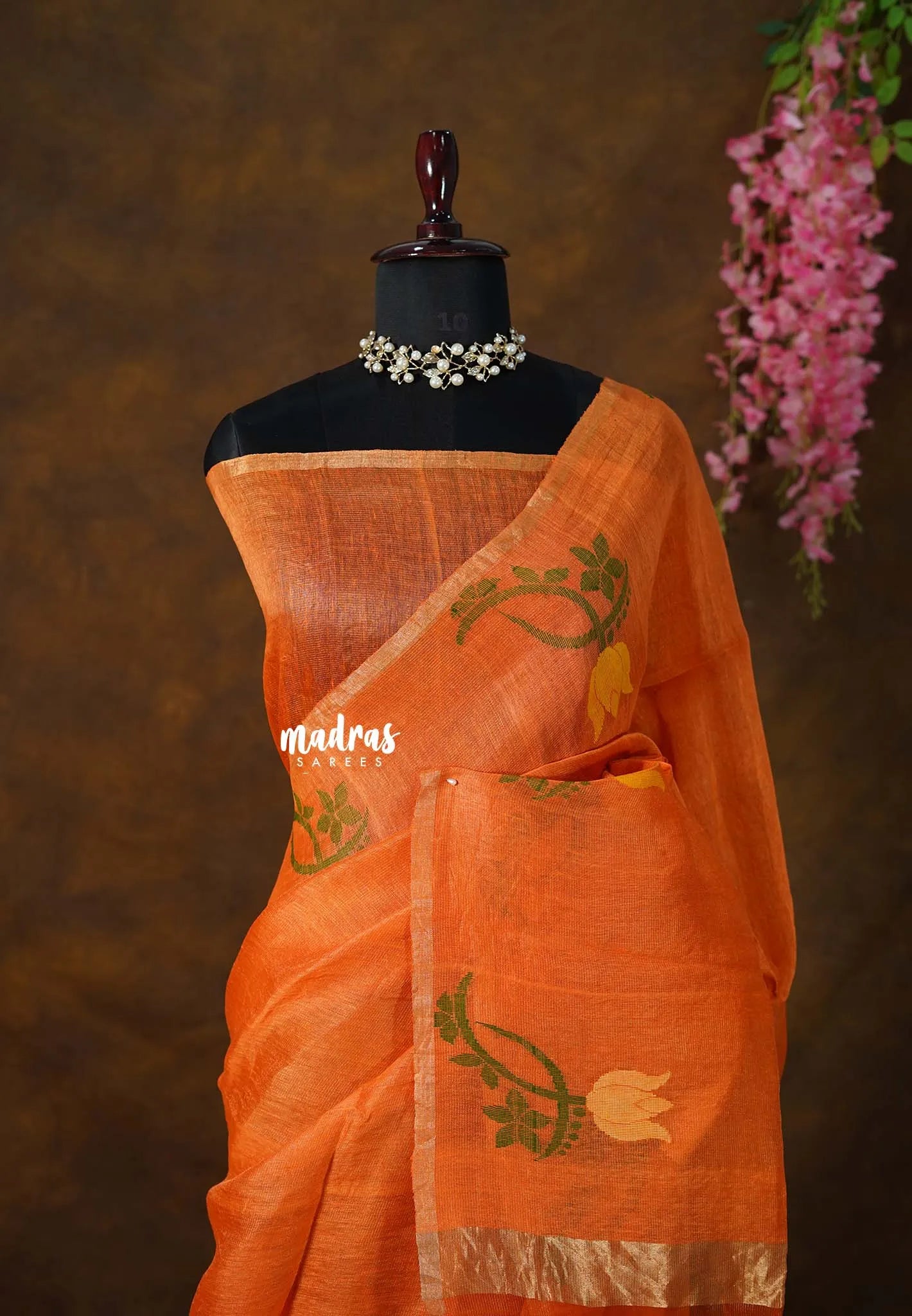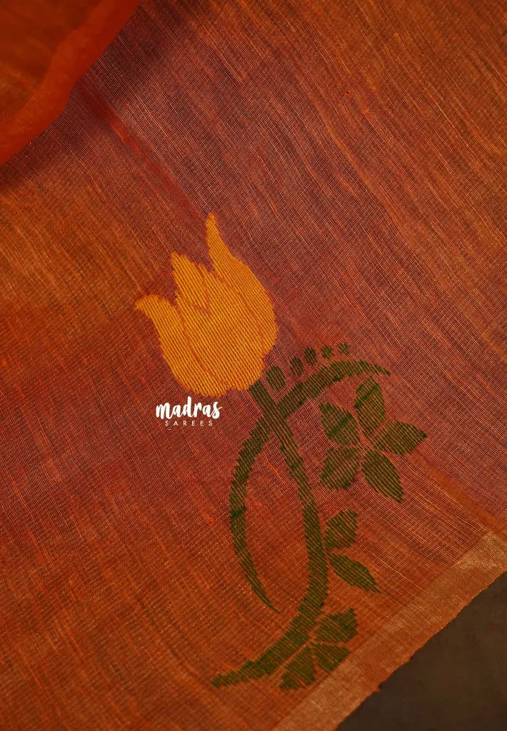 Crafted with love and tradition, this Handloom Silk Linen Jamdani Saree glows in a rich and beautifully enhanced with delicate floral Jamdani motifs. The natural silk-linen blend gives a soft texture, airy comfort, and an elegant fall that feels effortless yet luxurious.