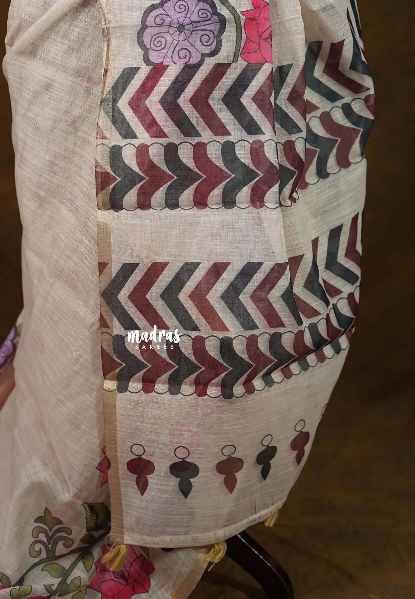 The pallu showcases a stunning chevron pattern with coordinated lotus artwork and tassels, enhancing the saree’s artistic look. Made from breathable linen cotton, it is perfect for women who love comfort and beauty combined.