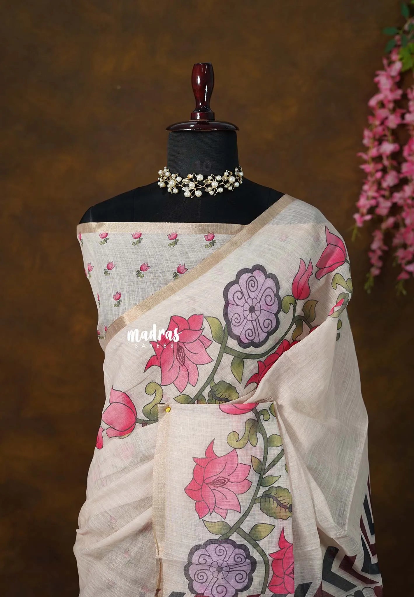Experience elegance with this Divine Lotus Linen Cotton Saree, beautifully crafted in a soothing sand beige shade. The saree features exquisite lotus floral motifs in rich pink tones, complemented by intricate vine designs in olive and earthy browns.
