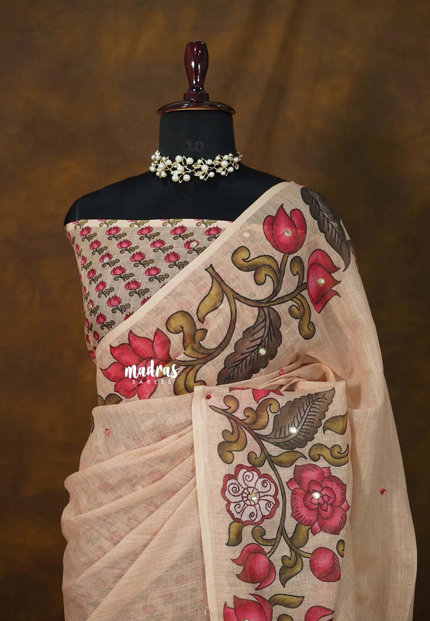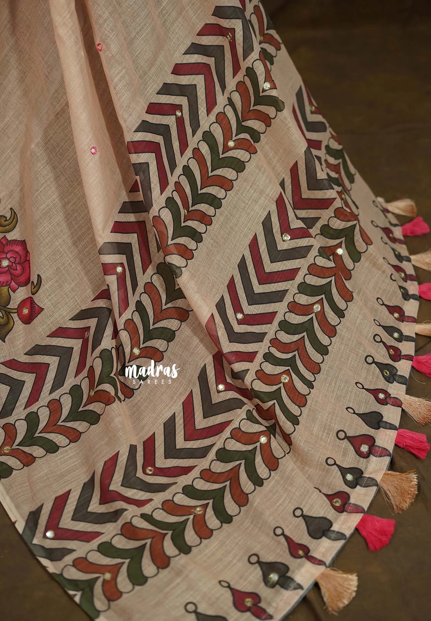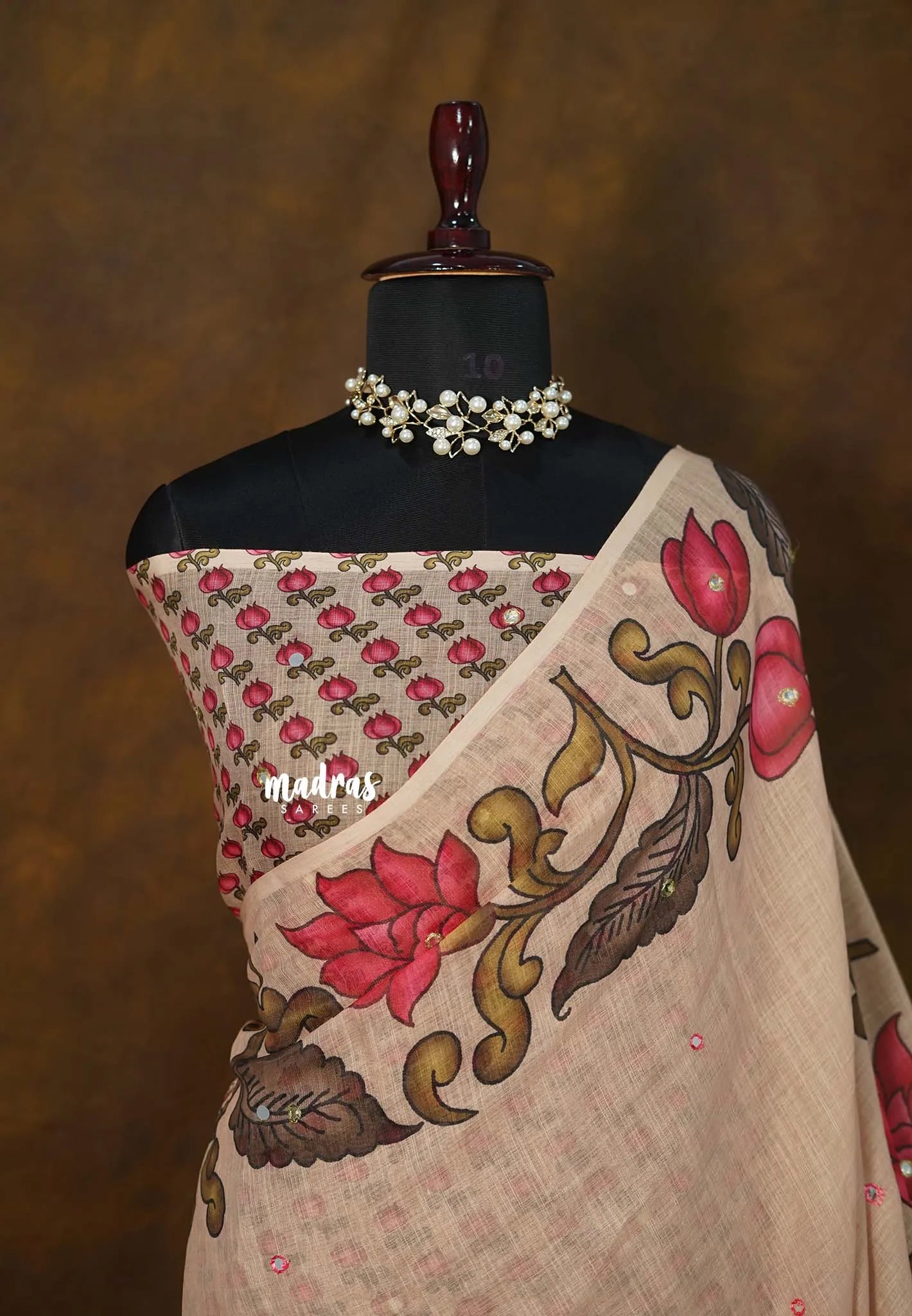 Experience elegance with this Divine Lotus Linen Cotton Saree, beautifully crafted in a soothing sand beige shade. The saree features exquisite lotus floral motifs in rich pink tones, complemented by intricate vine designs in olive and earthy browns.