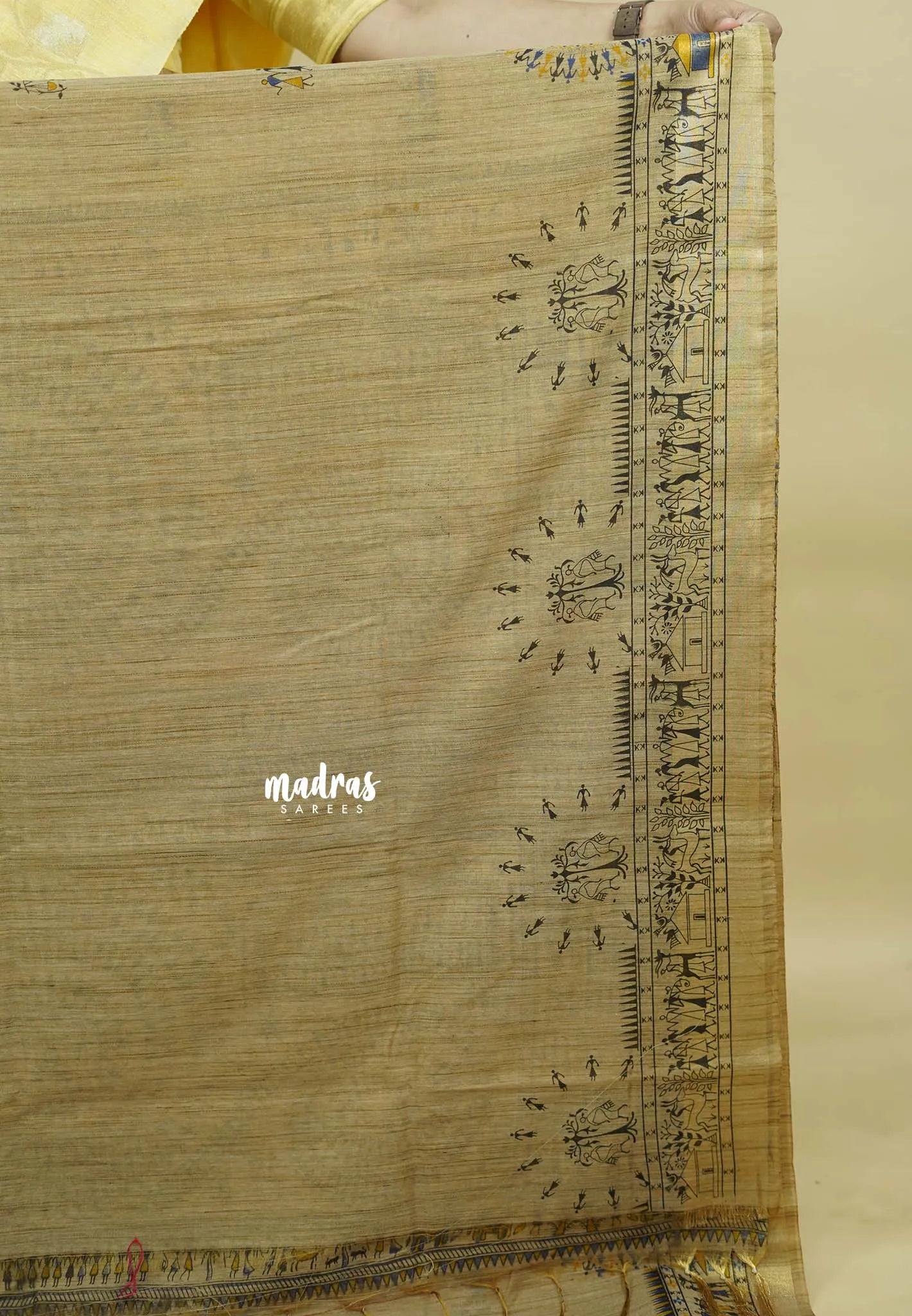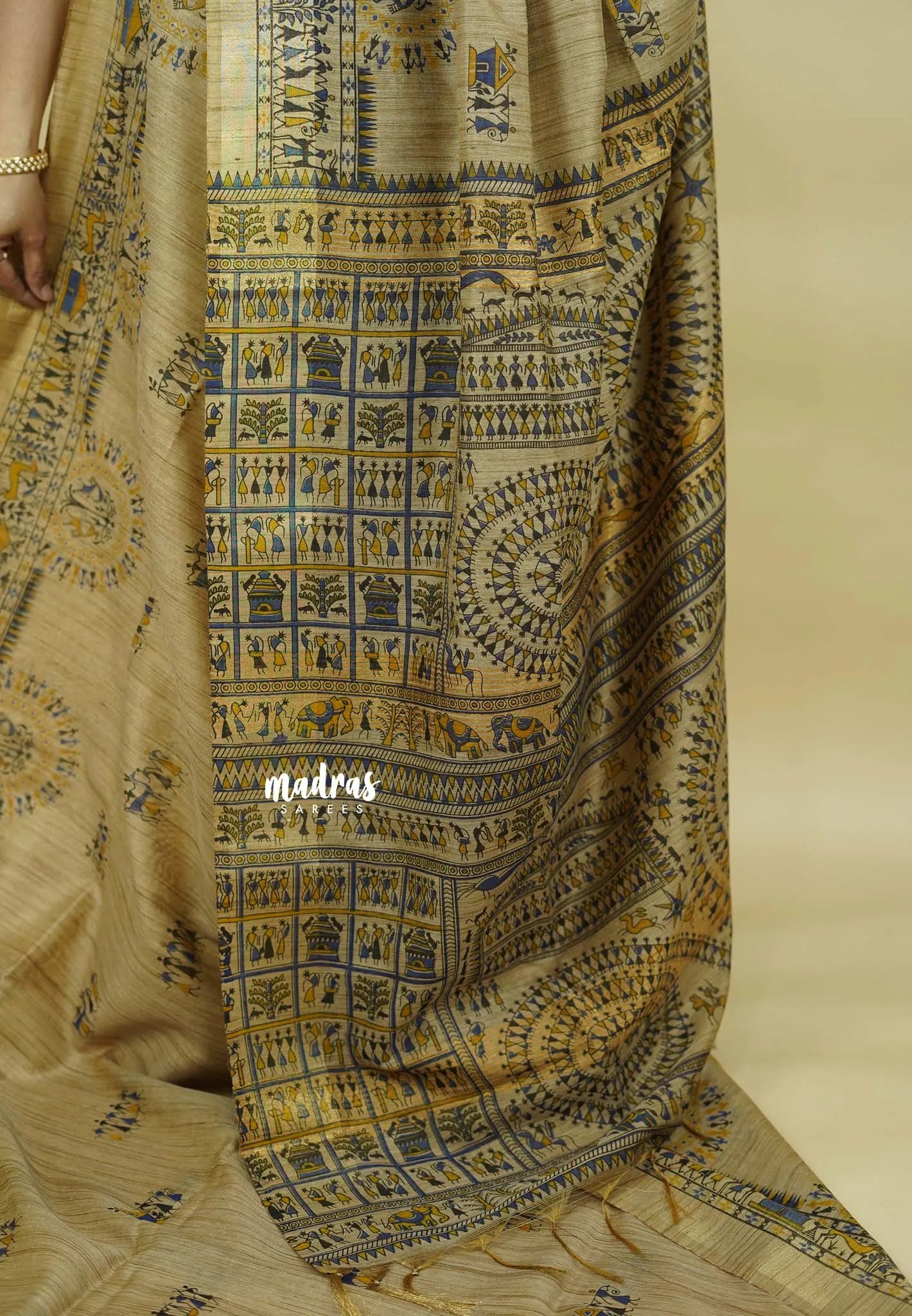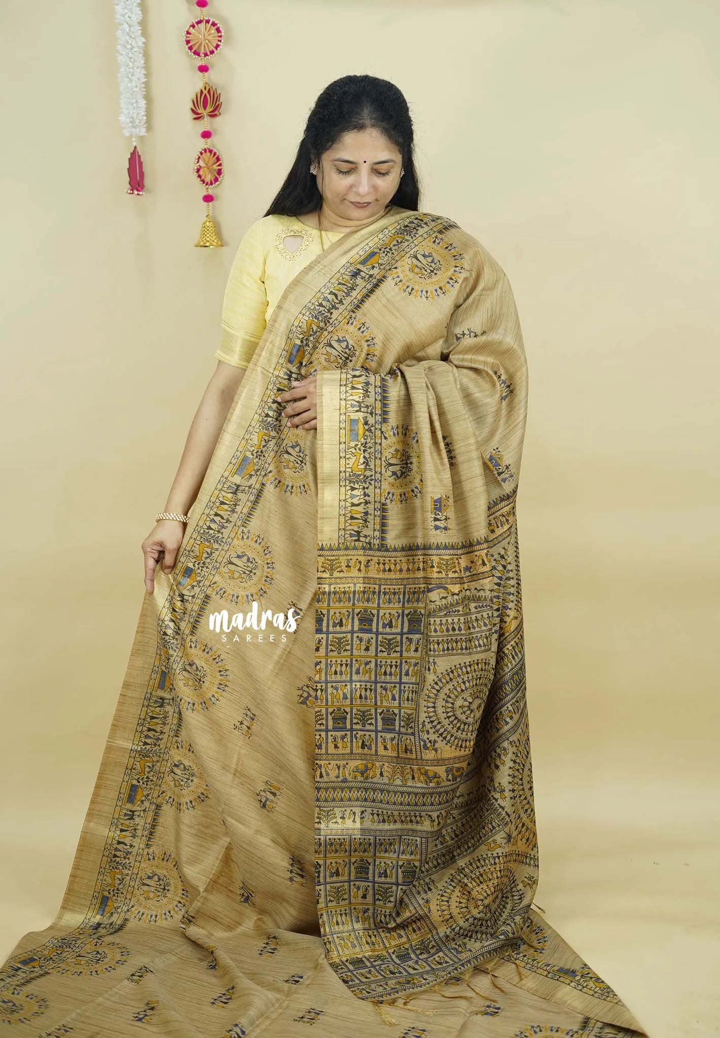 A semi-Tussar saree is made from a blend of Tussar silk and other fabrics, offering a lighter and more affordable alternative to pure Tussar silk. It has a natural sheen, soft texture, and is known for its elegant drape, making it perfect for both casual and festive occasions. Its intricate weaving and vibrant designs make it a versatile, timeless piece.