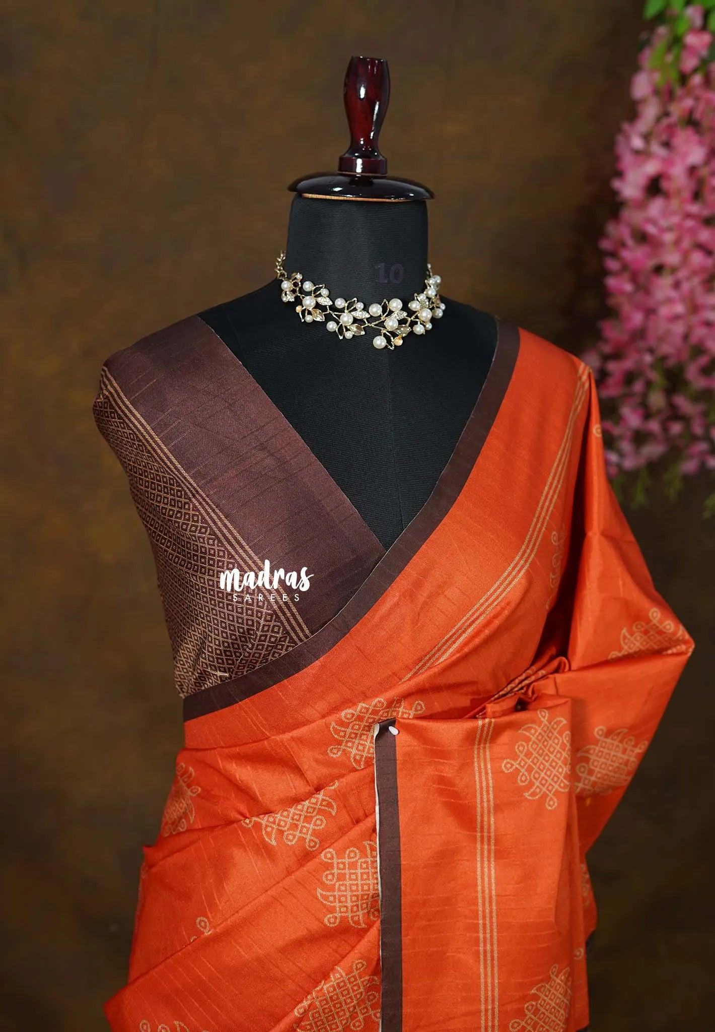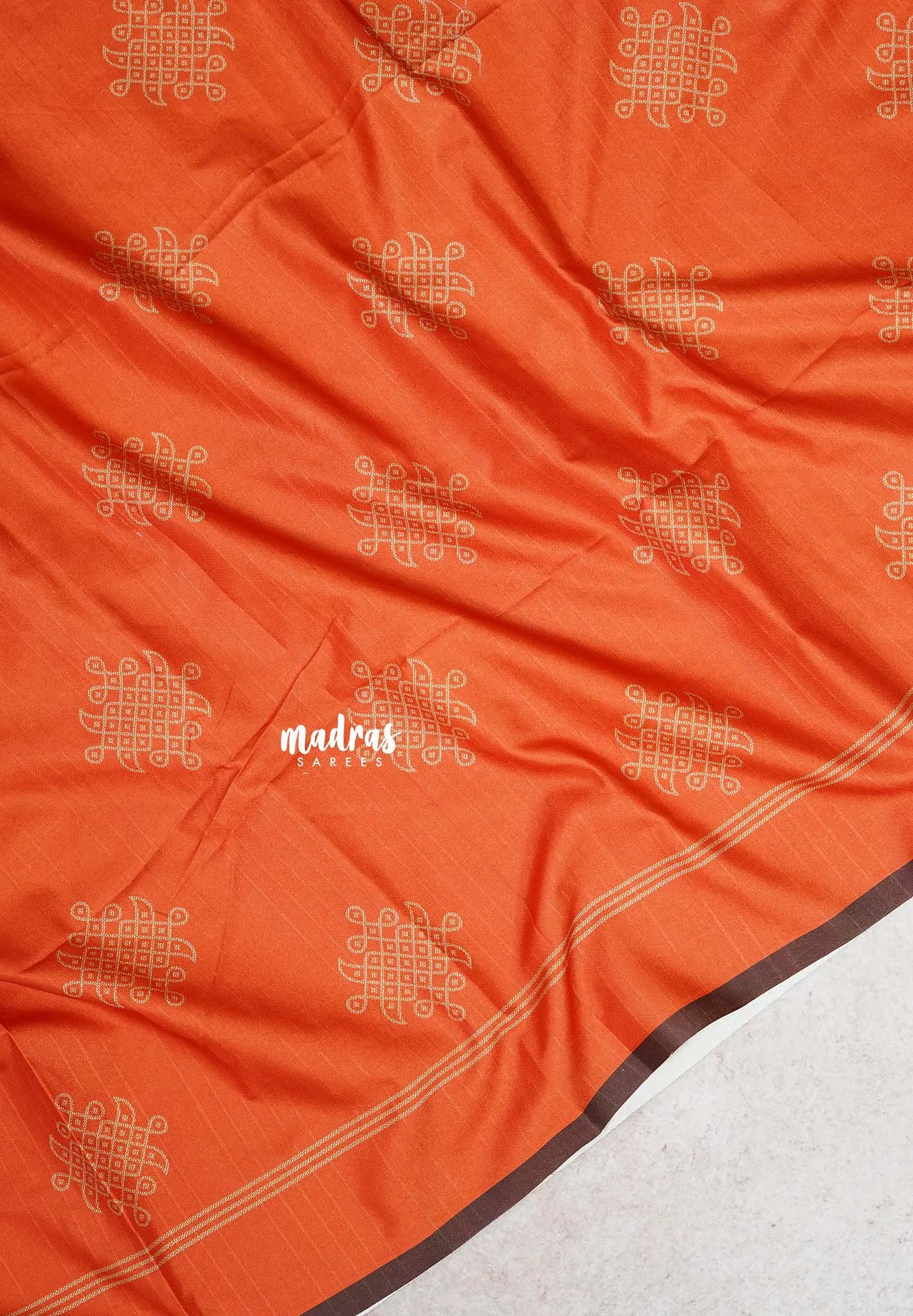 Chithiram – Sindoor Orange in Soft Paper Silk | Intricate Kolam Prints | Statement Contrast Pallu & Blouse | Effortless Casual Style