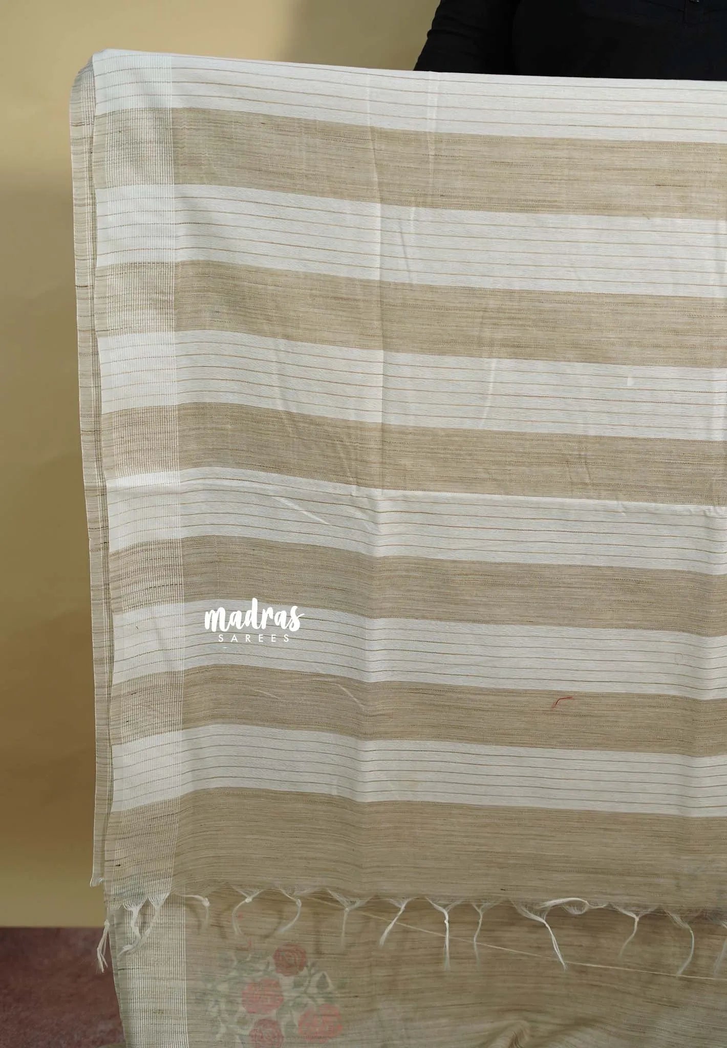 A semi-Tussar saree is made from a blend of Tussar silk and other fabrics, offering a lighter and more affordable alternative to pure Tussar silk. It has a natural sheen, soft texture, and is known for its elegant drape, making it perfect for both casual and festive occasions. Its intricate weaving and vibrant designs make it a versatile, timeless piece.