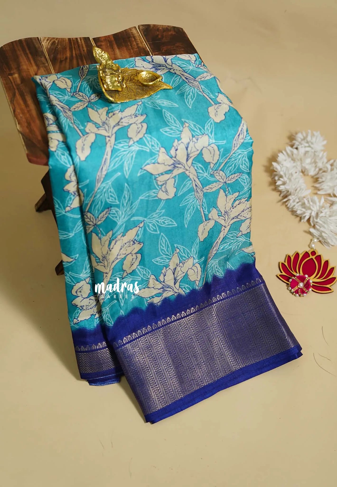 Exquisite floral-printed silk saree featuring a deep, regal base adorned with blooming pastel flowers. Its rich mustard-gold zari border adds a striking touch of opulence, making it perfect for elegant occasions.