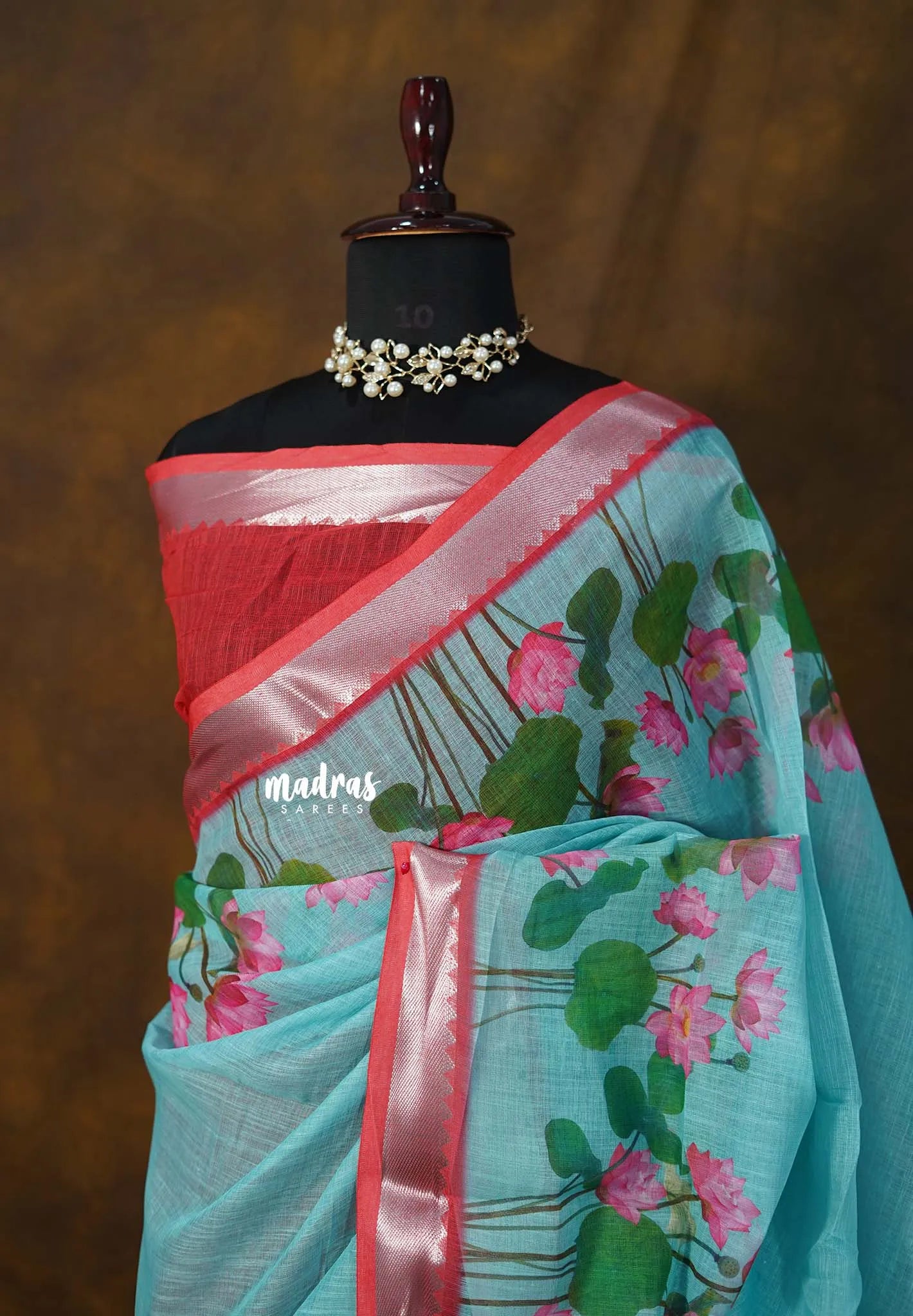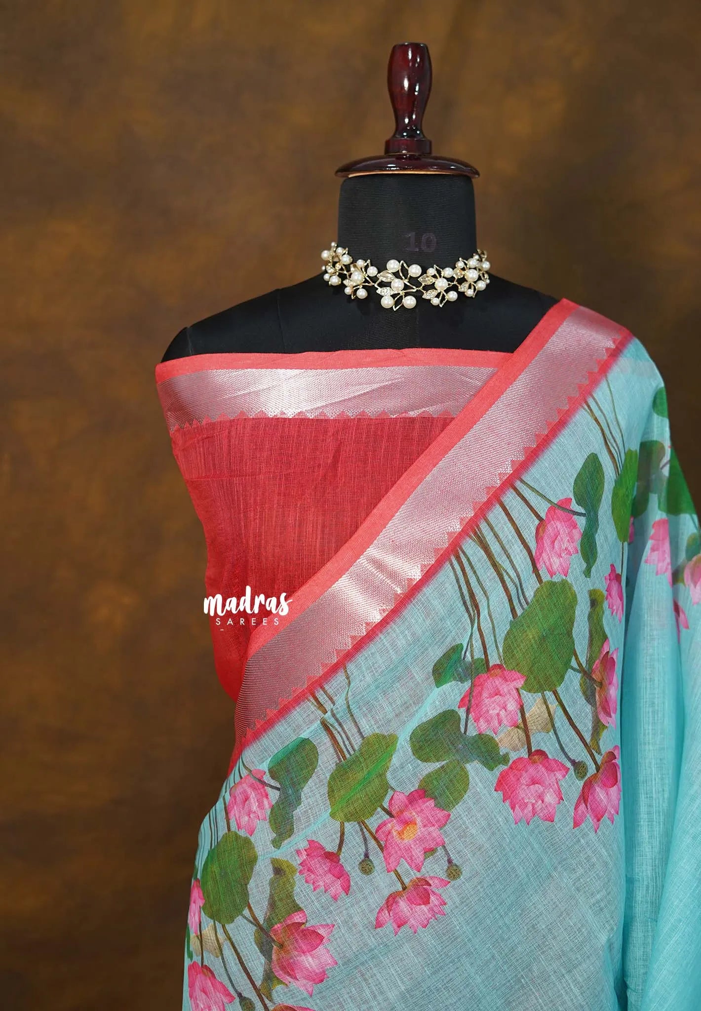 Experience elegance in its softest form with this premium Linen Cotton saree, adorned with a classic Mangalagiri zari border and a stunning Divine Lotus digital print.