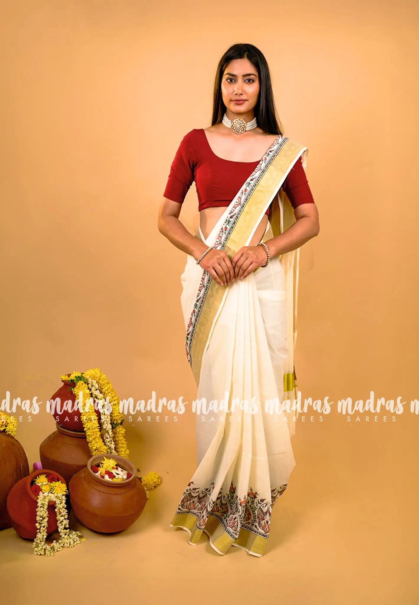 The Smt. Nirmala Sitharaman-inspired Madhubani hand-painted South cotton saree with a raw silk blouse combo in pearl white beautifully blends traditional craftsmanship with modern elegance. The saree features intricate Madhubani hand-painted designs, known for their vibrant, nature-inspired motifs, and is made from South cotton, a lightweight and breathable fabric perfect for comfort. The accompanying raw silk blouse adds a luxurious touch, with its natural texture and subtle sheen contrasting beautifully with the soft cotton. The pearl white color enhances the timeless appeal, making this saree an ideal choice for both formal and celebratory occasions.