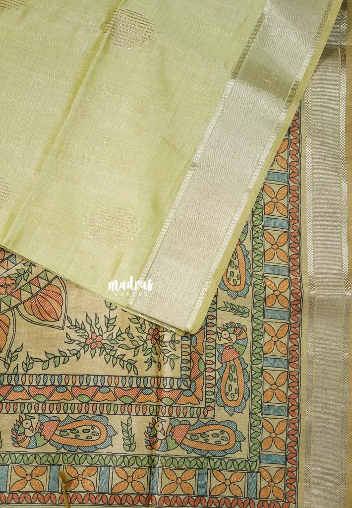 Soft Lime Green - Roopa - Premium Chappa semi Tussar with Madhupani Prints -  Perfect for Small Functions