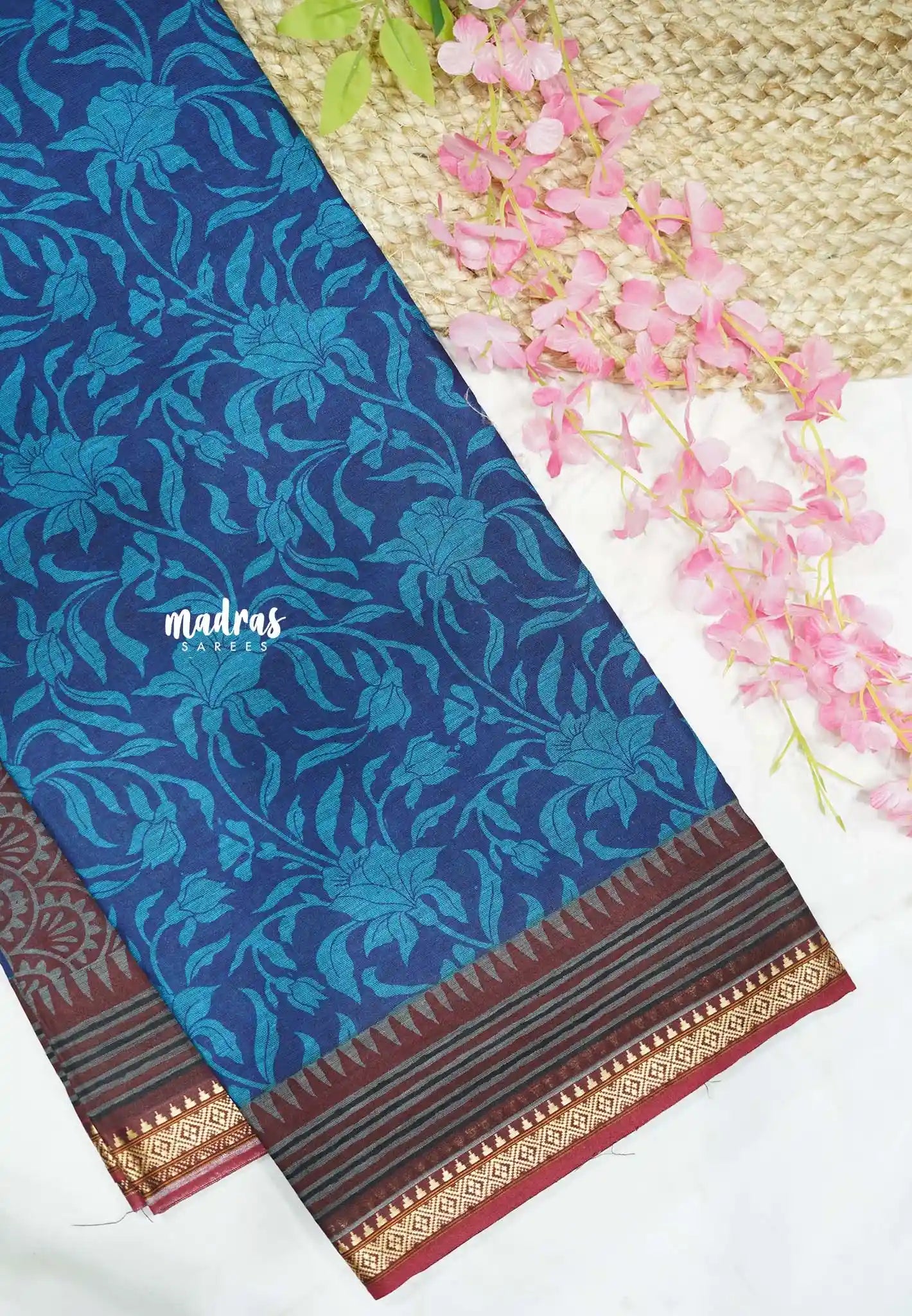 A Soft Muslin Cotton saree with big florals and a thread border would feature large, bold floral patterns across the fabric, providing a striking and elegant look. The soft muslin cotton gives it a lightweight and breathable feel, perfect for comfort. The thread border would add a delicate, intricate touch along the edges, complementing the florals without overpowering the design. It’s a blend of traditional and contemporary elements, ideal for festive occasions.
